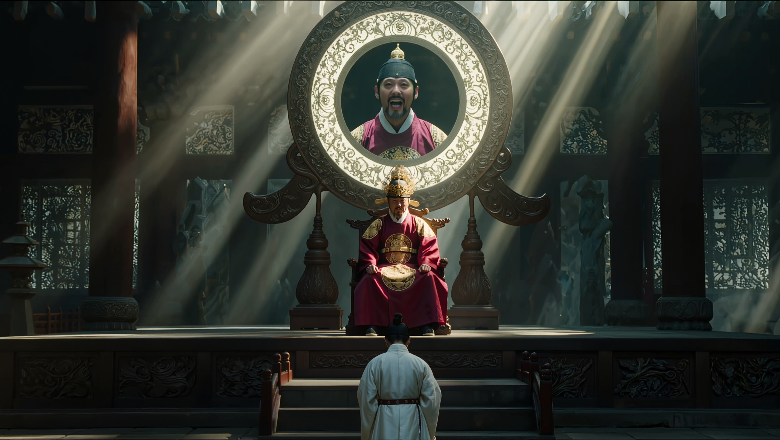 A photorealistic, highly detailed cinematic wide shot (16:9). A majestic and fearsome ancient Korean King Yeomra (Yama) seated on a grand traditional throne in a dimly lit, mysterious underworld court. He is wearing a magnificent golden crown and dark red royal robes with rich embroidery. In the center of the court, a giant, magical, ornate circular mirror (Upgyeongdae) emits a glowing ethereal light. Reflected in the mirror is an evil Joseon dynasty magistrate looking terrified. In the foreground, a humble, kind-looking Korean scholar in traditional white hanbok is bowing respectfully. Volumetric lighting, dramatic shadows, authentic Joseon folklore atmosphere, 8k resolution, no text.
