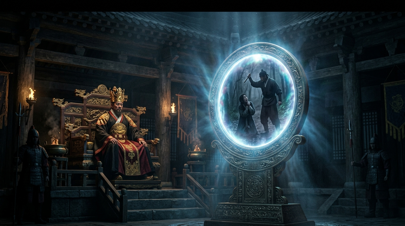 그러자 염라대왕의 눈썹이 꿈틀거리더니 손에 든 명패를 책상에 내리쳤습니다. "명부의 재판에서 한 점의 의혹도 남겨서는 아니 된다. 당장 저자를 업경대(業鏡臺) 앞에 세워라!" 염라대왕의 명에 따라 옥졸들이 배 참봉을 대전 한가운데에 놓인 거대한 거울 앞으로 이끌었습니다. 시청자 여러분, 이 업경대라는 거울이 바로 저승 재판의 핵심이자 묘미입니다. 업경대는 나무로 조각된 불길과 쌍룡이 휘감고 있는 둥글고 거대한 거울인데, 아무리 입에 침을 바르고 거짓말을 하는 교활한 자라도 이 거울 앞에서는 절대 진실을 숨길 수가 없습니다. 망자가 거울 앞에 서면, 마치 우물물에 파문이 일듯 거울 면이 일렁이더니 살아생전 지은 모든 행적이 소리도 없이 생생하게 비치기 시작하는 신령스러운 보물이기 때문입니다. 배 참봉이 덜덜 떨며 거울 앞에 서자, 맑은 거울 속에는 이승에서의 참혹했던 며칠 전의 광경이 고스란히 떠올랐습니다.