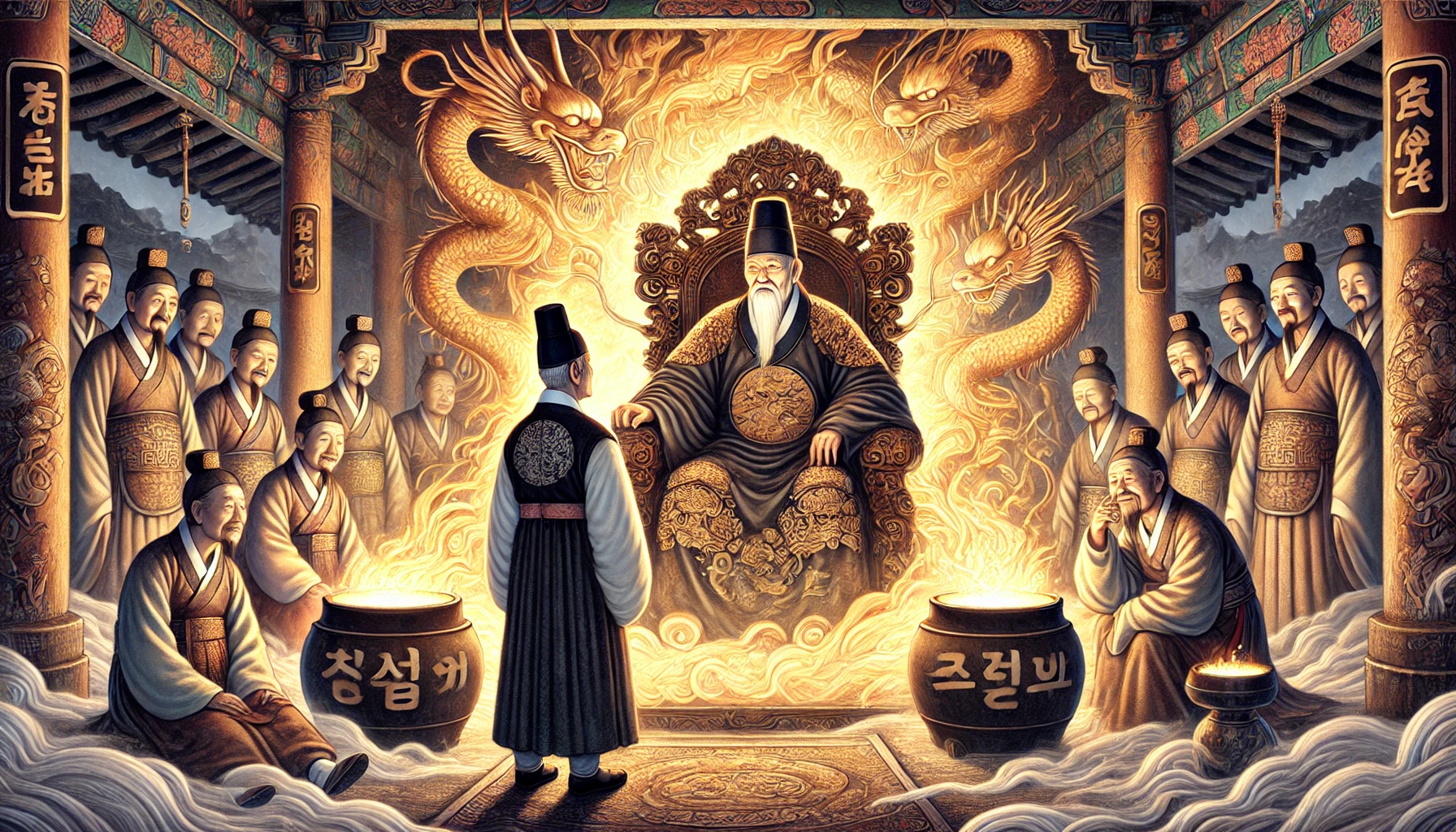 황 영감은 천천히 고개를 들었습니다. 그의 눈은 두려움에 떨지도, 원망을 품지도 않은 채 그저 맑고 고요했습니다. 주변에 도열한 판관들과 옥졸들은 황 영감의 초라한 행색을 보며 저들끼리 수군거렸습니다.