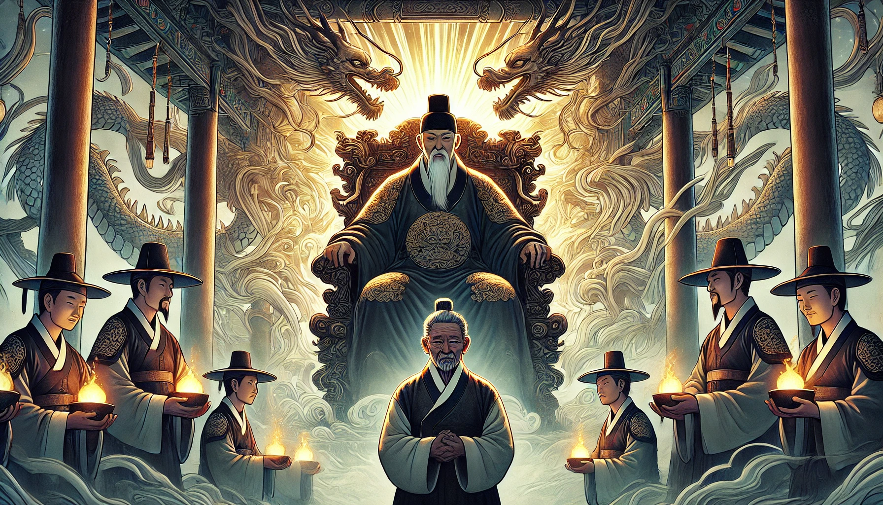염라대왕은 떨리는 손으로 황 영감을 일으켜 세웠습니다. 그의 눈은 더 이상 한낱 망자를 심판하는 왕의 눈이 아니었습니다. 깊은 존경과 깨달음을 얻은 현자의 눈빛이었습니다.
