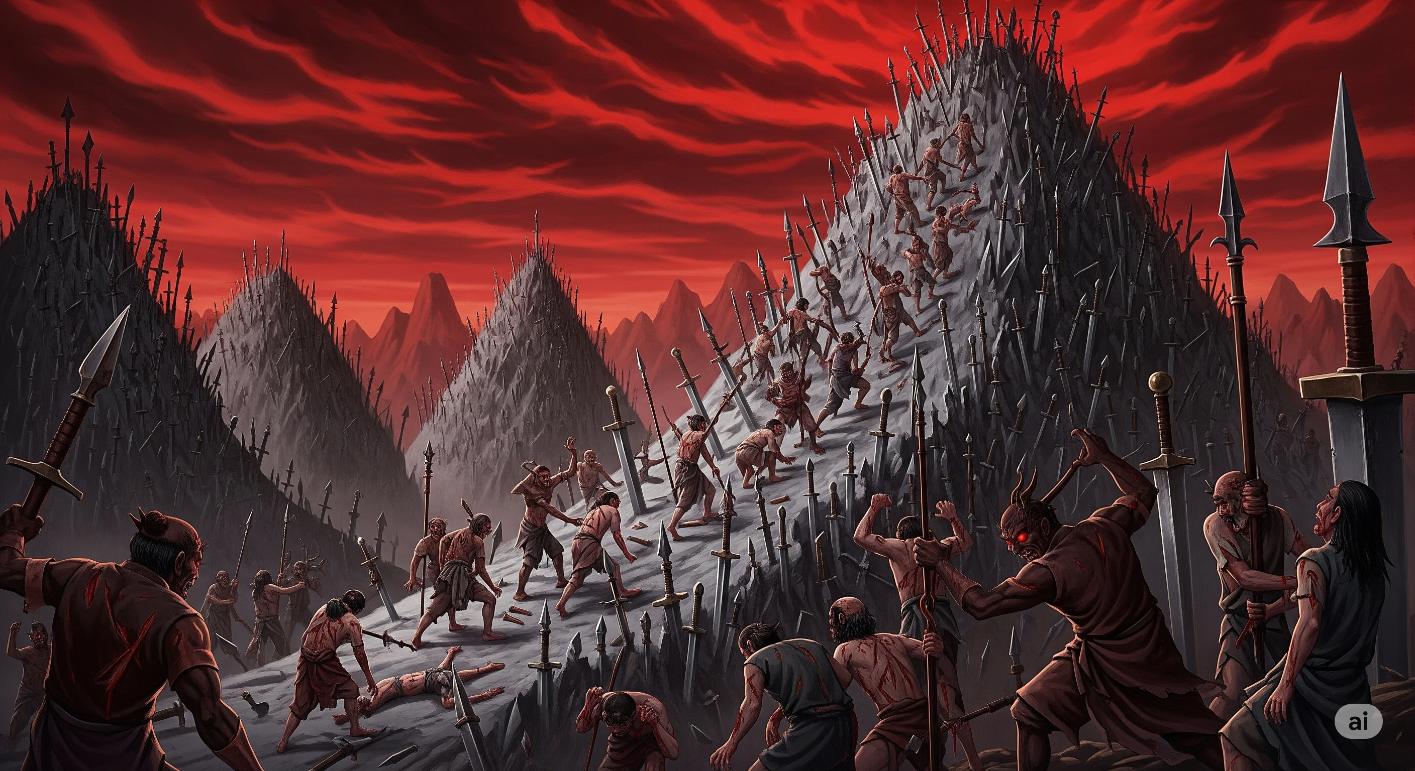 주변에는 이미 수많은 영혼들이 칼산 위를 오르내리며 피를 흘리고 있었다. 어떤 영혼은 칼날에 온몸이 꿰뚫린 채 산 중턱에 매달려 있었고, 어떤 영혼은 발을 헛디뎌 아래로 굴러떨어지며 온몸이 난자당했다. 그러나 그들은 죽을 수도 없었다. 칼날에 찢겨나가 너덜너덜해진 몸은 잠시 후면 다시 원래대로 돌아왔고, 그러면 옥졸들은 다시 그들을 칼산 위로 내몰았다. 영원히 반복되는 고통, 그것이 바로 도산지옥의 형벌이었다. 한때 떵떵거리며 살았던 무관 하나가 칼날 위에서 울부짖었다. "내가 전쟁터에서 수많은 적을 베었으나, 그것은 나라를 위한 일이었거늘! 어찌하여 이리도 가혹한 형벌을 받아야 한단 말인가!" 그러나 그의 외침은 공허한 메아리가 되어 사라질 뿐, 그의 고통을 덜어주지는 못했다.