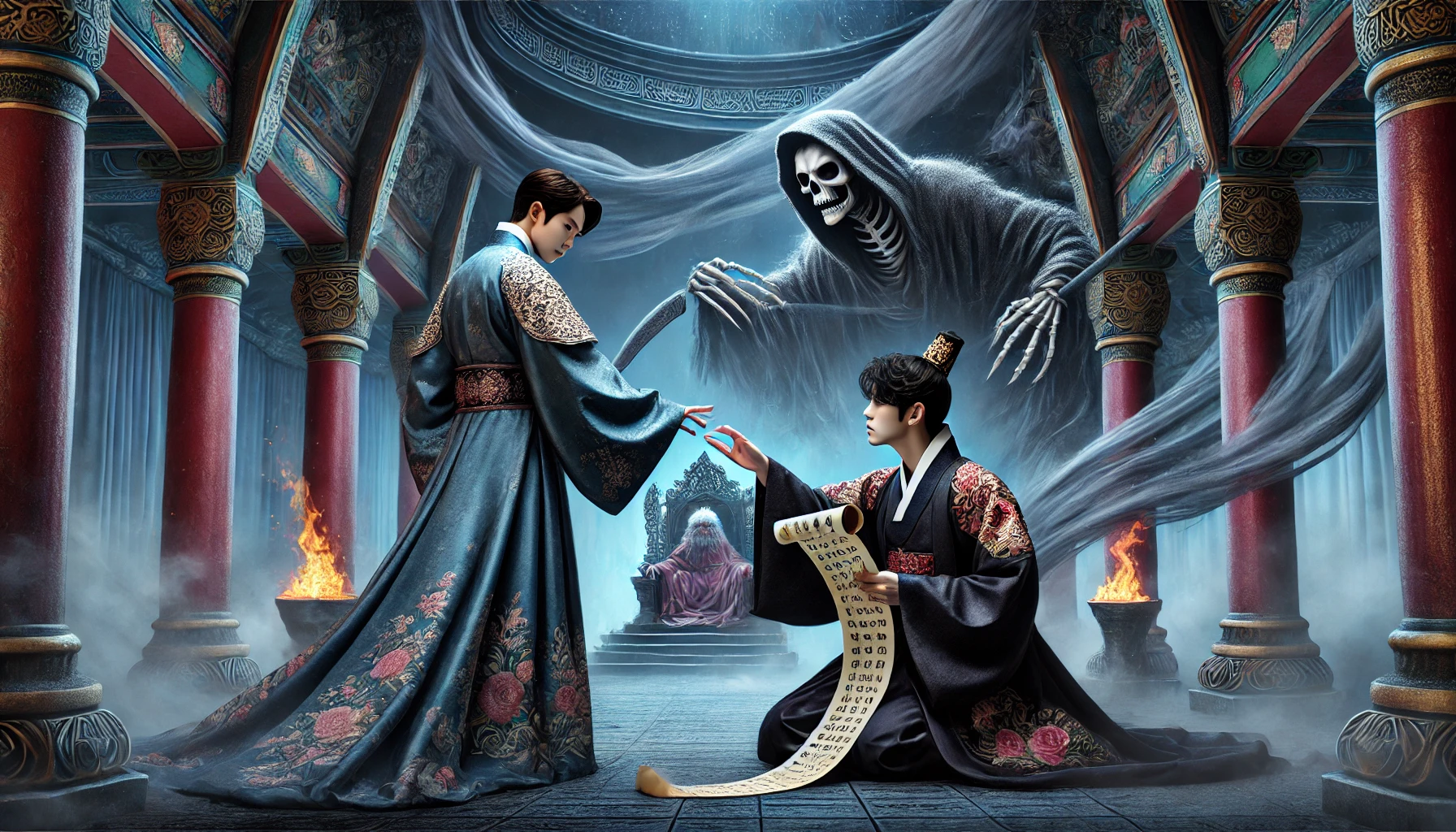그는 숨을 고르며 수정된 기록을 바라보았다. 이제 돌이킬 수 없었다. 그는 저승의 법을 어겼고, 죽은 자의 명부를 조작했다. 이것은 저승에서 가장 큰 죄 중 하나였다.
