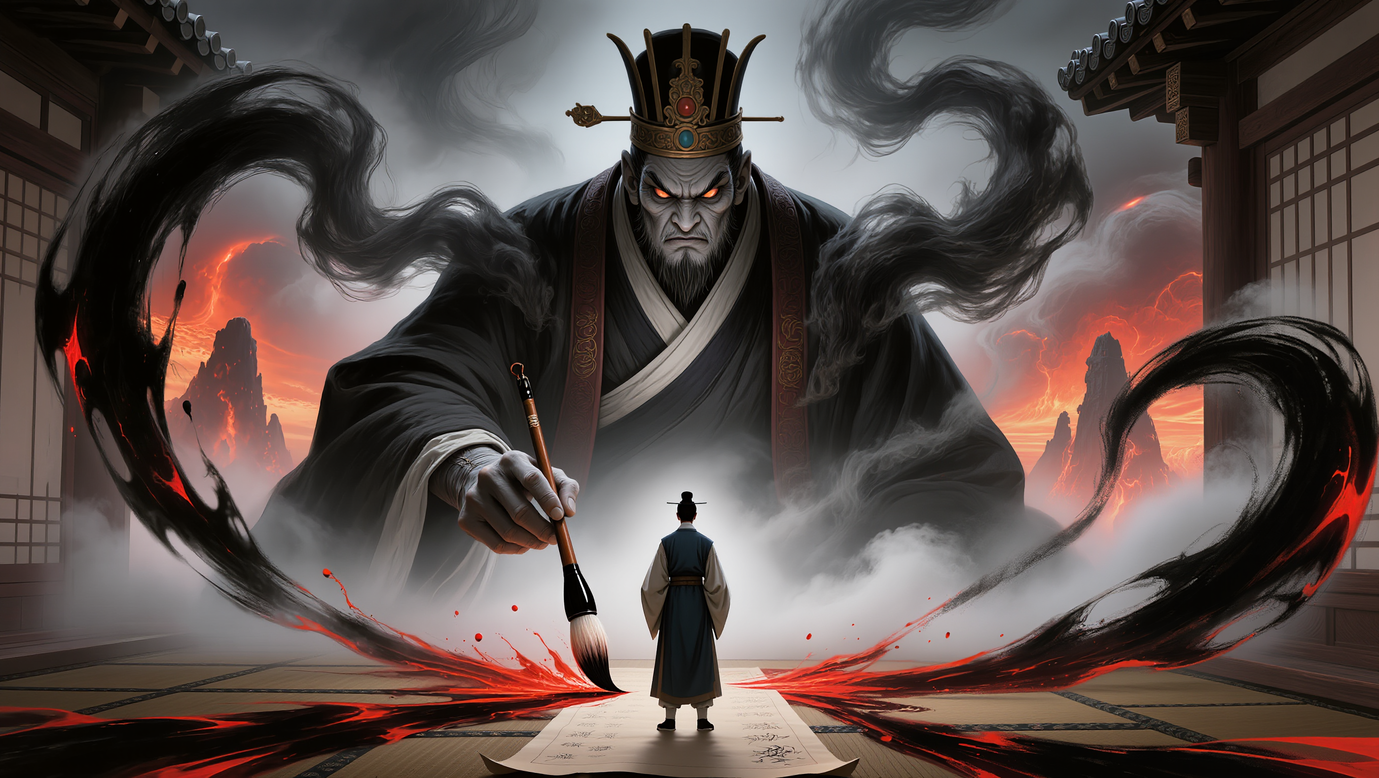 우여곡절 끝에 염라의 궁전, 시왕청에 도달한다. 저 멀리서 보았을 때부터 숨이 막혔다. 하늘을 찌를 듯한 석조 기둥이 수십 개 서 있고, 그 사이사이를 붉은 장막이 드리우고 있다. 기둥에는 금빛으로 경문이 새겨져 있는데, 글자 하나하나가 살아 움직이며 읽는 자의 죄를 소리 없이 묻는다. 장막 뒤에서 들려오는 소리가 있다. 천둥 같기도 하고, 수만 명이 동시에 우는 소리 같기도 한 묵직한 울림. 그리고 마침내, 장막 뒤에 앉아 있는 거대한 실루엣과 마주한다. 산 하나가 앉아 있는 것 같다. 형체의 윤곽만으로도 온몸의 털이 곤두선다.
