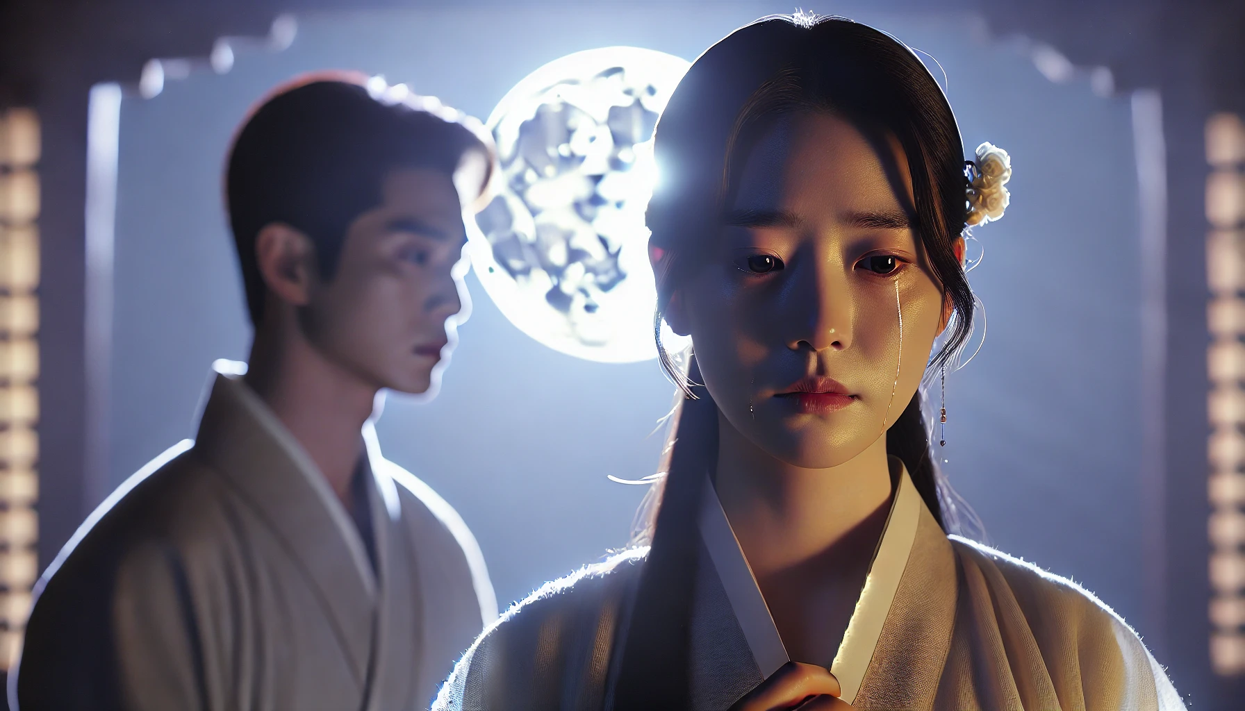 깊은 산골 마을, 아무도 찾지 않는 어두운 밤하늘 아래에서 홀로 우는 여인이 있었다. 달빛에 비친 그녀의 얼굴은 슬픔으로 물들어 있었고, 눈가에 흐르는 눈물은 마치 오래전부터 쌓여 온 한 맺힌 사연을 품고 있는 듯했다. 그녀의 옆에 서 있던 남자는 그저 말없이 그녀의 얼굴을 바라볼 뿐이었다. 달빛은 그들의 인연을 비추며, 마치 이 사랑이 금지되었음을 암시하는 듯한 서늘한 기운을 남겼다.