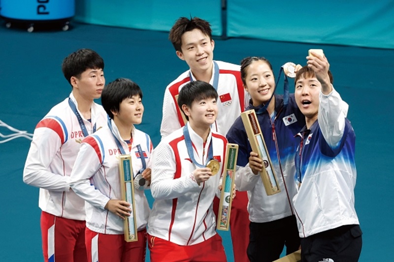 탁구 혼합복식 동메달의 주인공 신유빈·임종훈이 금메달을 획득한 중국의 왕추친·쑨잉사, 은메달을 획득한 북한 리정식·김금용과 휴대폰으로 기념촬영을 하고 있다.