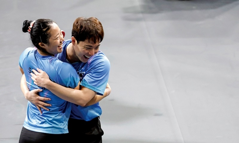 탁구에서는 ‘삐약이’ 신유빈과 임종훈이 혼합복식 경기에서 동메달을 목에 걸었다. 탁구에서 12년 만의 메달이 확정되는 순간 두 선수가 기쁨의 포옹을 하고 있다.
