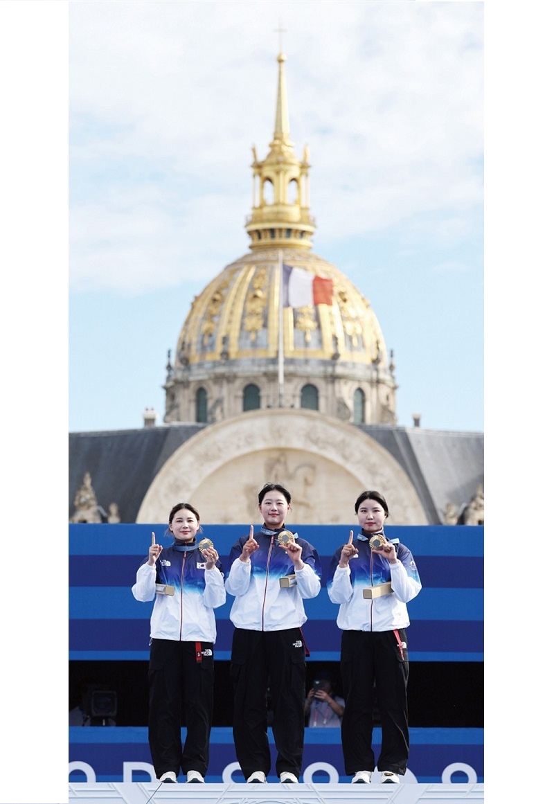 7월 28일 파리 레쟁발리드 양궁 경기장에서도 신화가 만들어졌다. 우리나라 양궁 여자 대표팀이 단체전에서 중국을 꺾고 우승하며 10연패의 위업을 달성한 것이다. 금메달 시상대에 오른 한국 양궁 여자 대표팀의 남수현, 임시현, 전훈영은 손가락과 금메달로 숫자 10을 만들며 양궁 세계 최강국임을 세계에 알렸다. 단체전이 처음 도입된 1988 서울올림픽부터 이어진 연패 기록으로 세계 양궁 역사에 새로운 금자탑을 쌓았다. 이는 현재 진행 중인 특정 나라의 특정 종목 연속 우승 최다 타이기록이다. 외신들은 “만약 어떤 스포츠가 한 국가에 지배된다면 바로 한국과 여자 양궁”, “올림픽 최고의 왕조” 등으로 소개하면서 찬사를 보냈다.