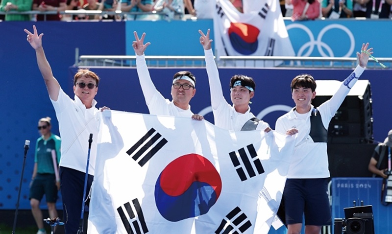 7월 30일에는 양궁 남자 대표팀이 한국 양궁의 존재감을 한 번 더 확인시켜줬다. 김우진, 이우석, 김제덕으로 이뤄진 남자 대표팀은 2016 리우올림픽, 2020 도쿄올림픽에 이어 3회 연속 정상에 올랐다. ‘파이팅 포효’로 유명한 김제덕은 활을 쏠 때 손등에 벌이 앉았음에도 흔들리지 않고 10점 과녁을 명중해 화제가 됐다.