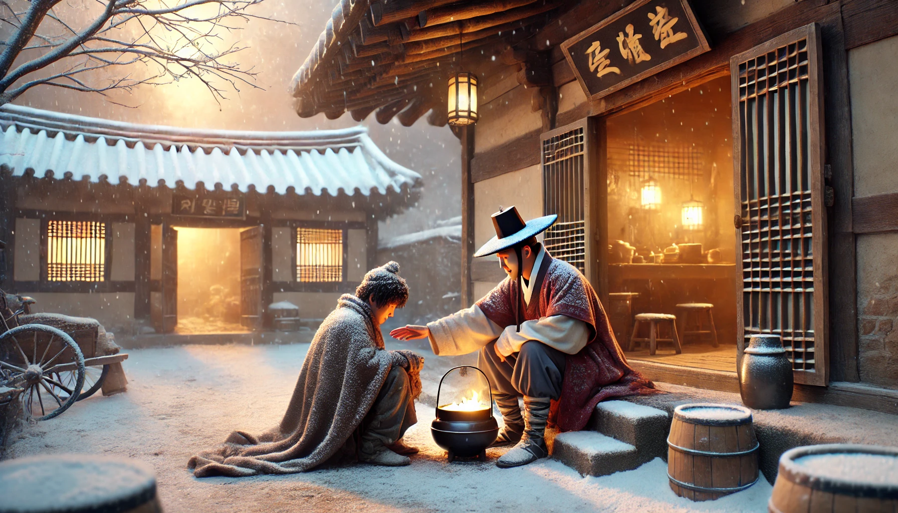 그 순간, 거지의 얼굴에 미약한 희망이 떠올랐다. 그는 작게 고개를 숙이며 들어섰다. 주막 안의 온기는 그의 몸을 감싸며 얼어붙은 감각을 조금씩 되살려 주었다. 주인은 그를 구석의 작은 자리에 앉히며 말했다. “앉아 계세요. 따뜻한 차라도 준비해 드릴게요.”