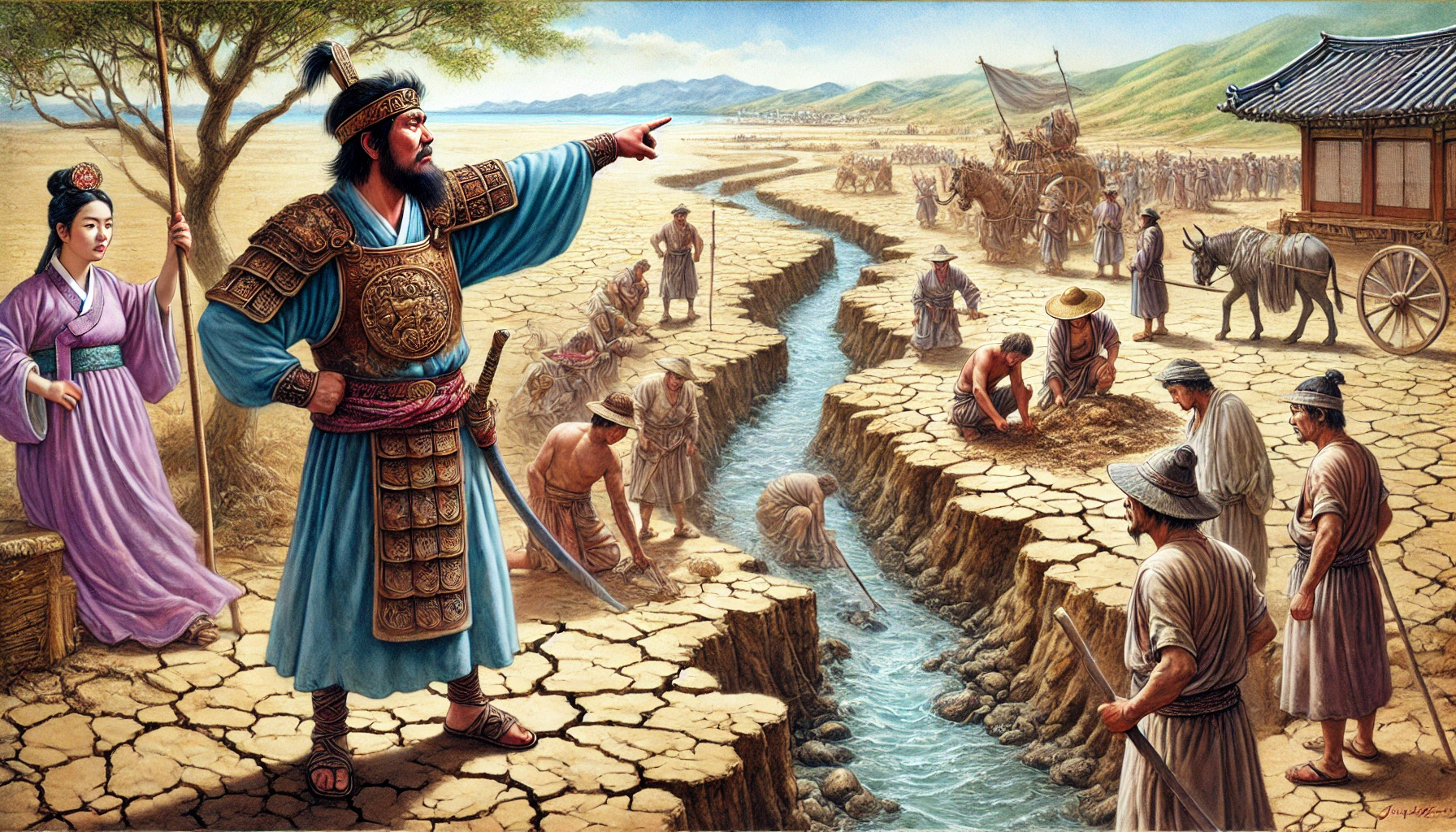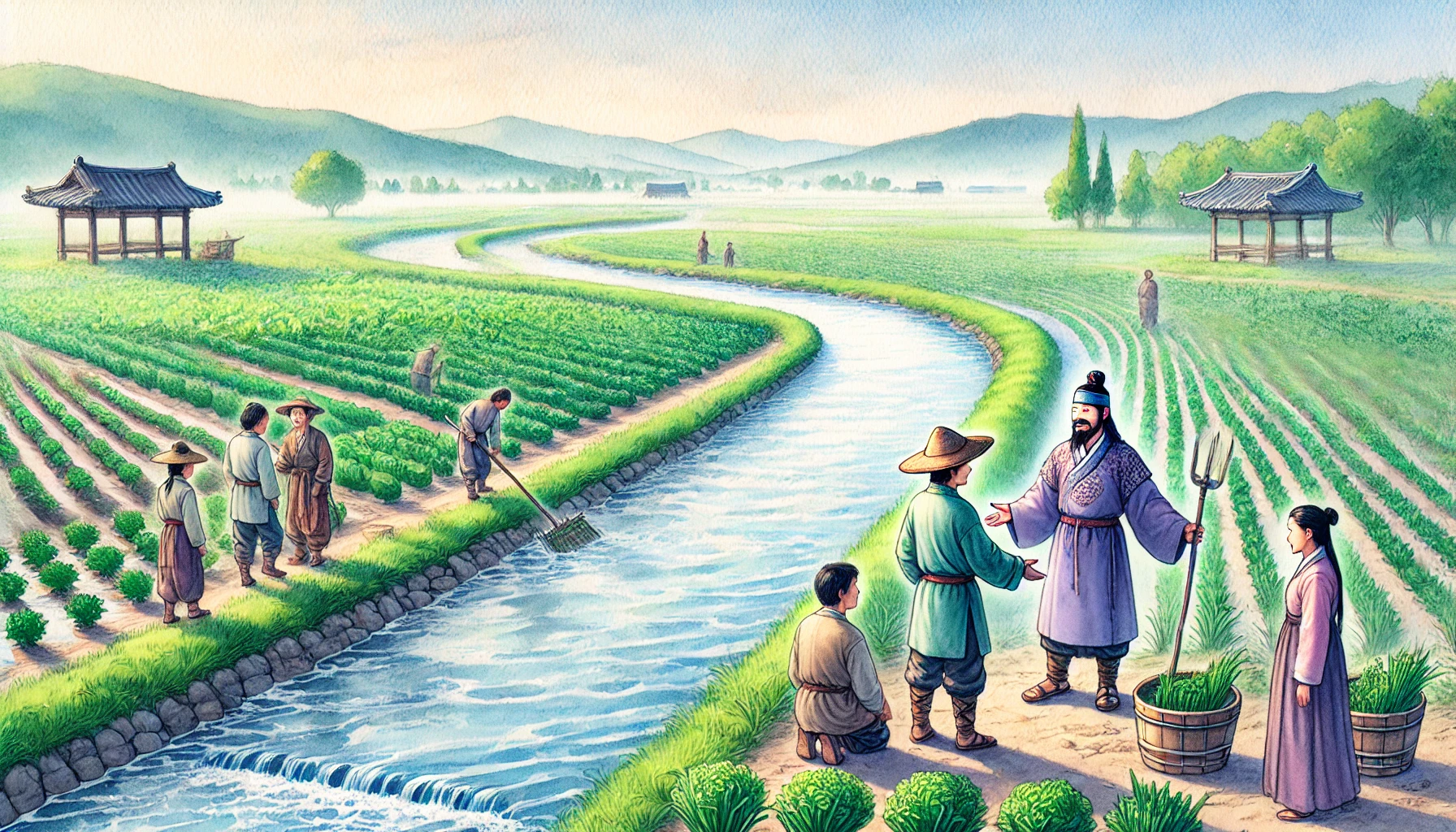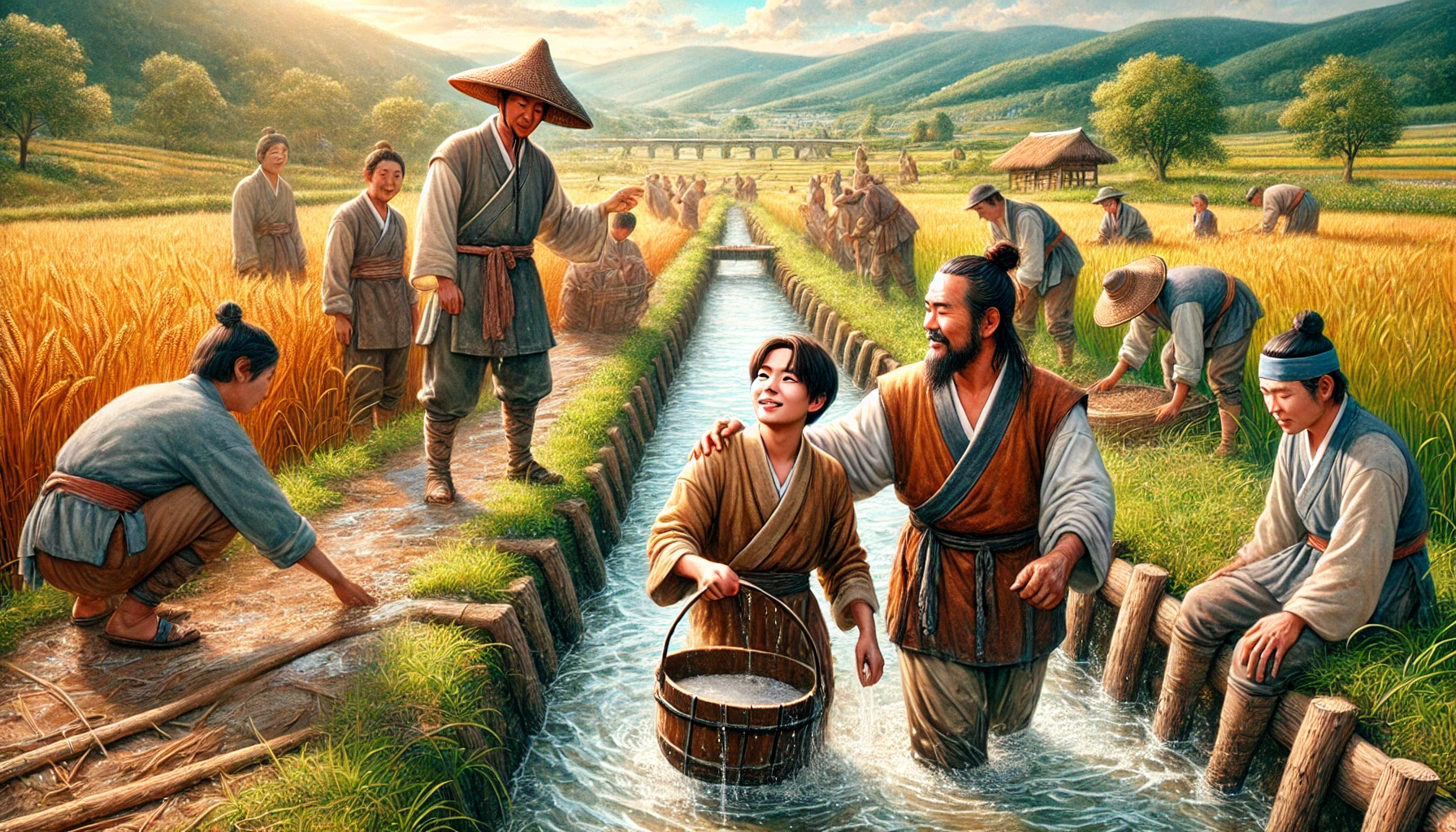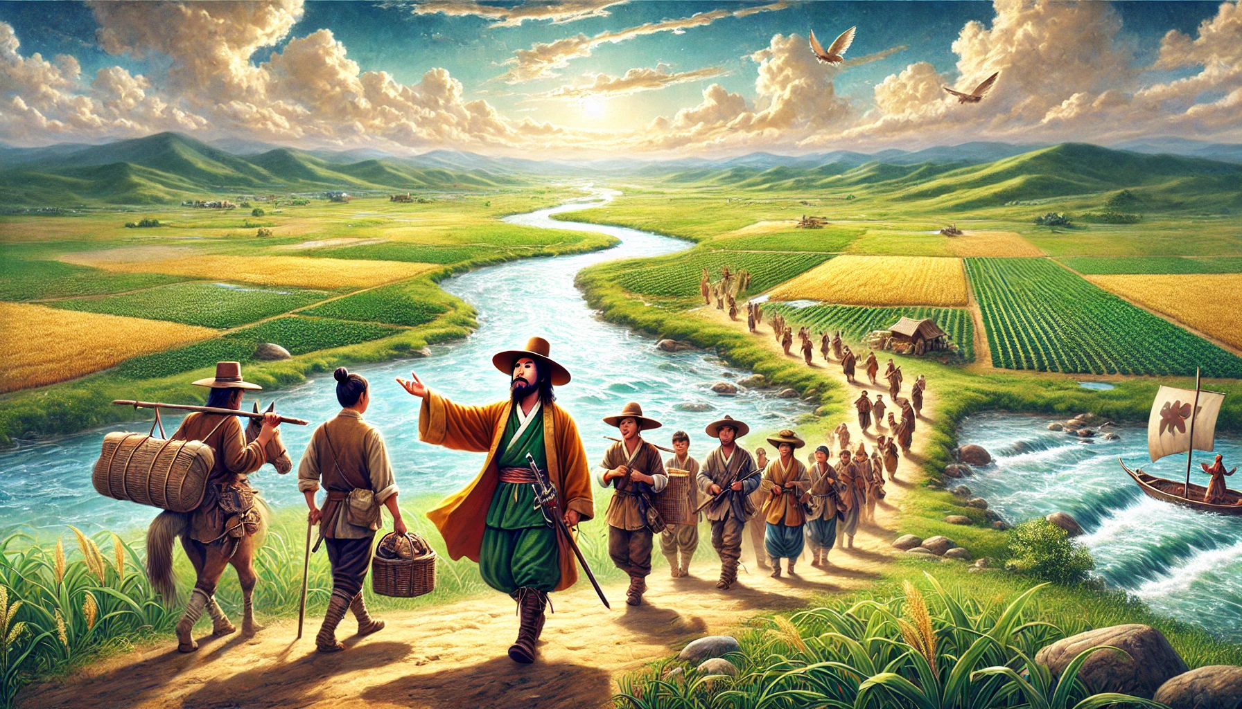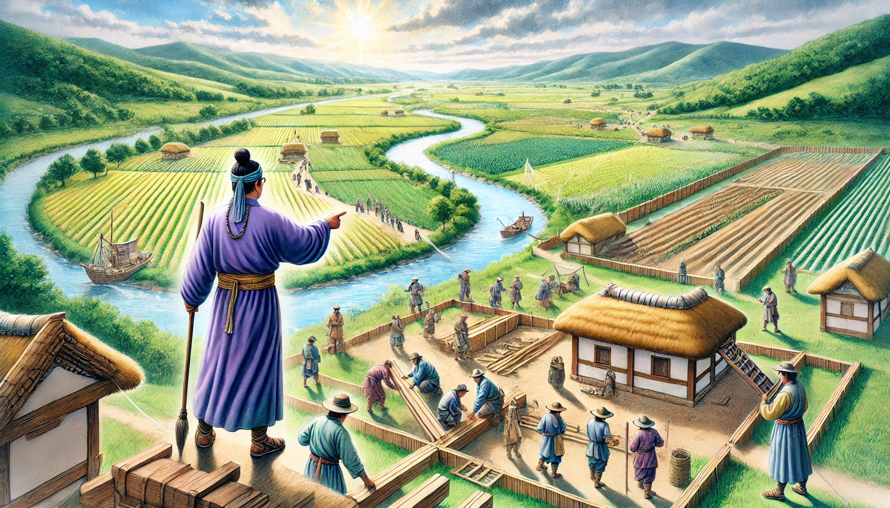 어느 날, 온조는 강가를 걸으며 마을의 남자들과 함께 물길을 살폈다. 그들은 강물을 농경지로 끌어오기 위해 물길을 새로 내야 했다. 하지만 물길을 돌리는 것은 쉽지 않은 작업이었다. 며칠 밤낮을 고심하던 온조는 드디어 적절한 물길을 찾아냈고, 그것을 따라 수로를 만드는 작업을 시작했다. 백성들은 그의 지시 아래 힘을 합쳐 새로운 농경지를 완성해갔다. 그리고 얼마 지나지 않아, 그들의 땅은 강물이 흐르고 곡식이 자라는 비옥한 들판으로 변하기 시작했다.