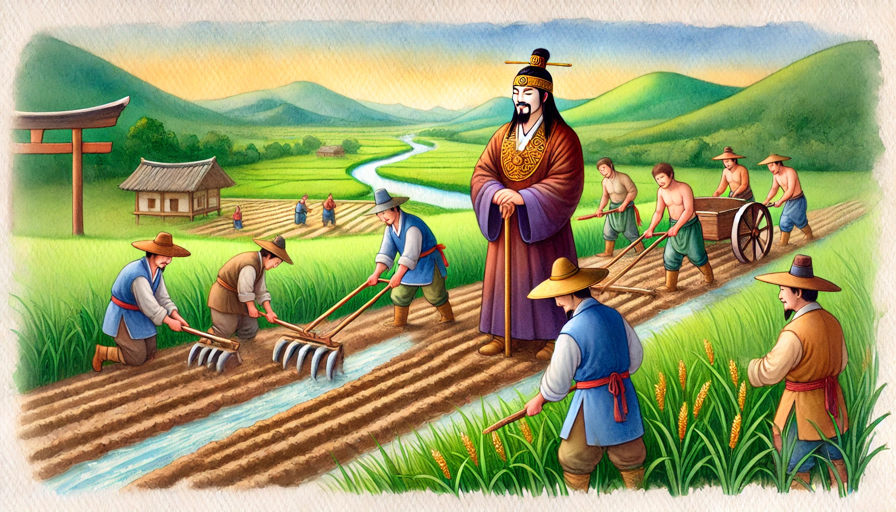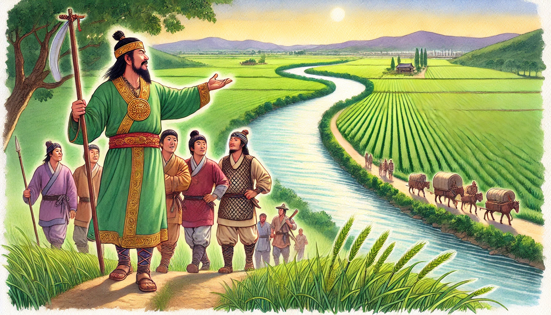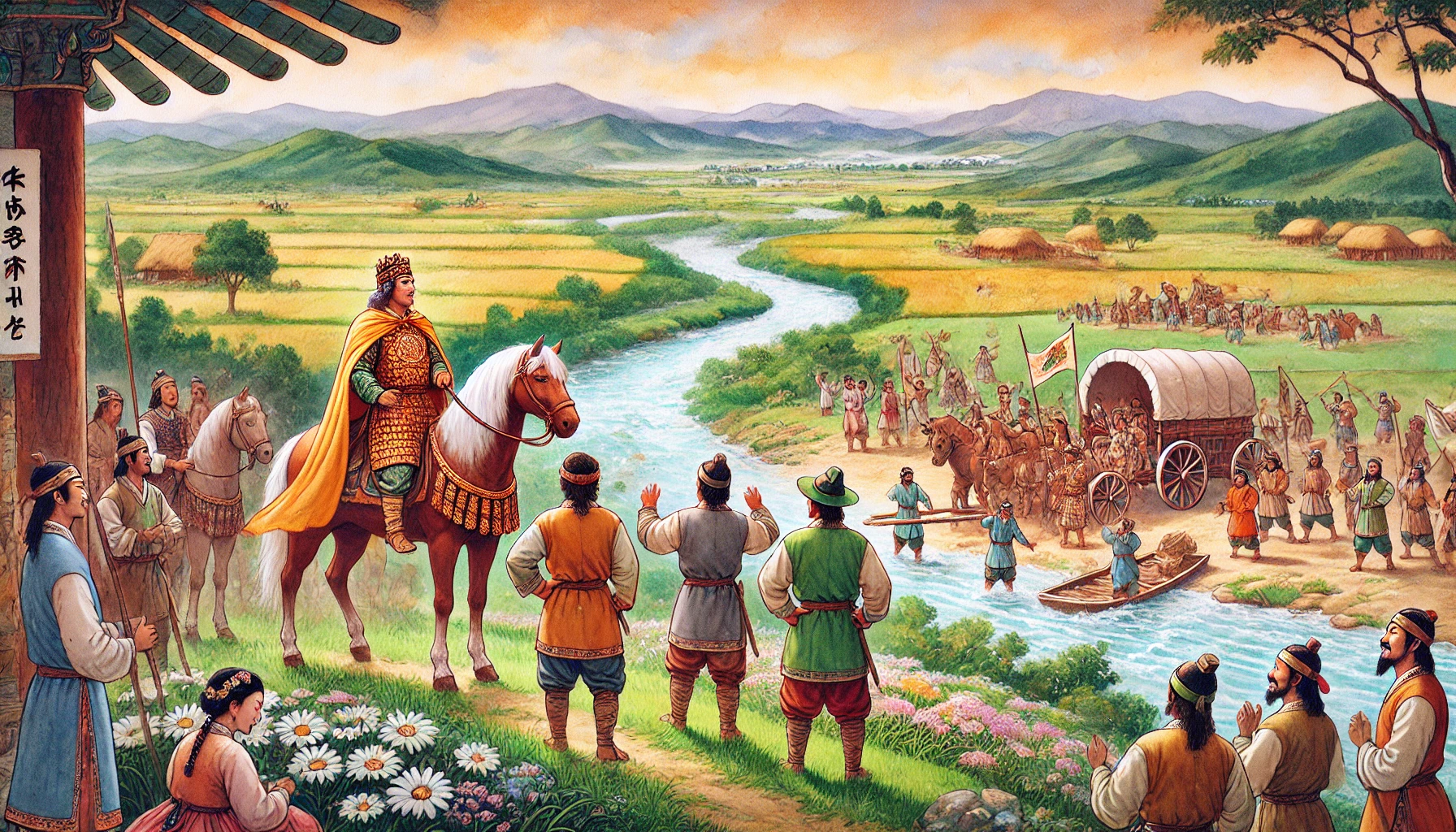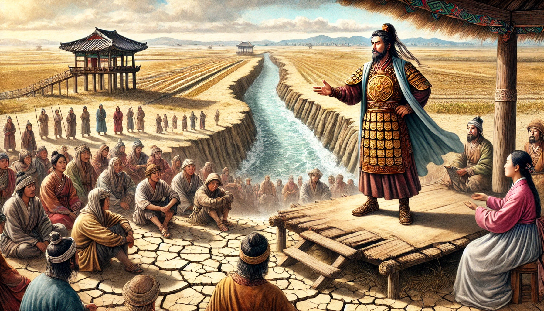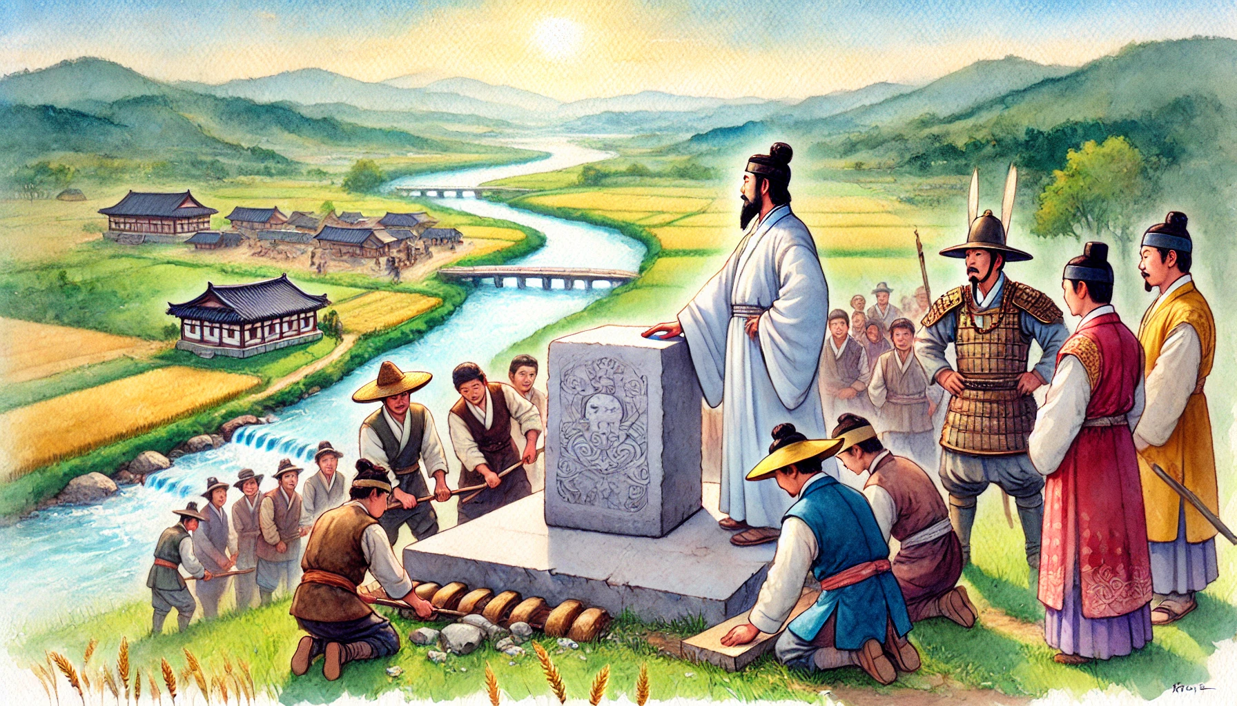 어느 날, 온조는 강가를 걸으며 마을의 남자들과 함께 물길을 살폈다. 그들은 강물을 농경지로 끌어오기 위해 물길을 새로 내야 했다. 하지만 물길을 돌리는 것은 쉽지 않은 작업이었다. 며칠 밤낮을 고심하던 온조는 드디어 적절한 물길을 찾아냈고, 그것을 따라 수로를 만드는 작업을 시작했다. 백성들은 그의 지시 아래 힘을 합쳐 새로운 농경지를 완성해갔다. 그리고 얼마 지나지 않아, 그들의 땅은 강물이 흐르고 곡식이 자라는 비옥한 들판으로 변하기 시작했다.