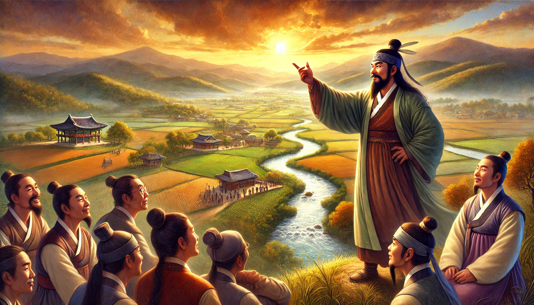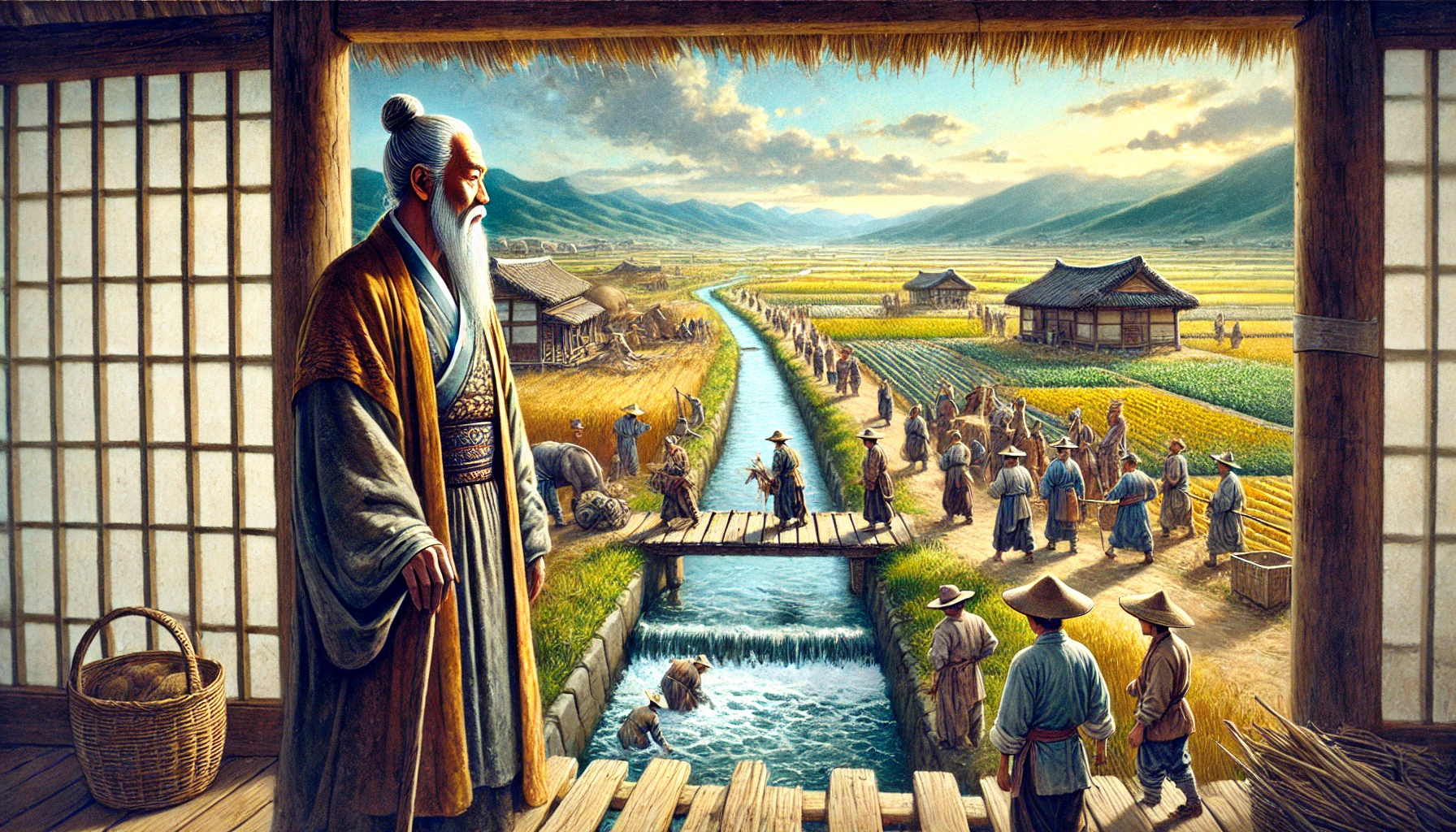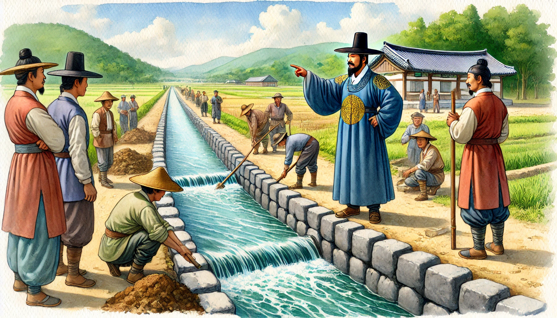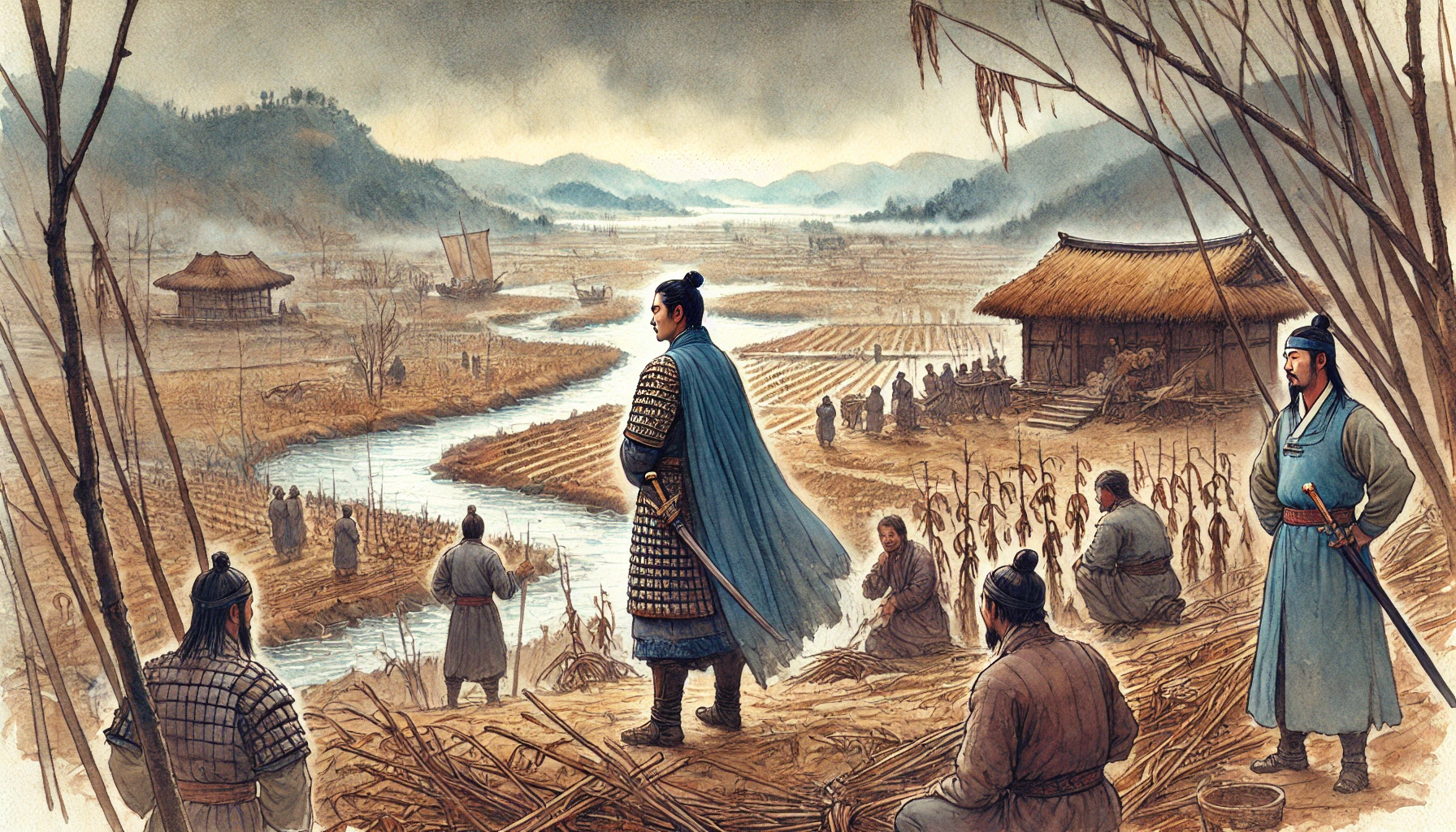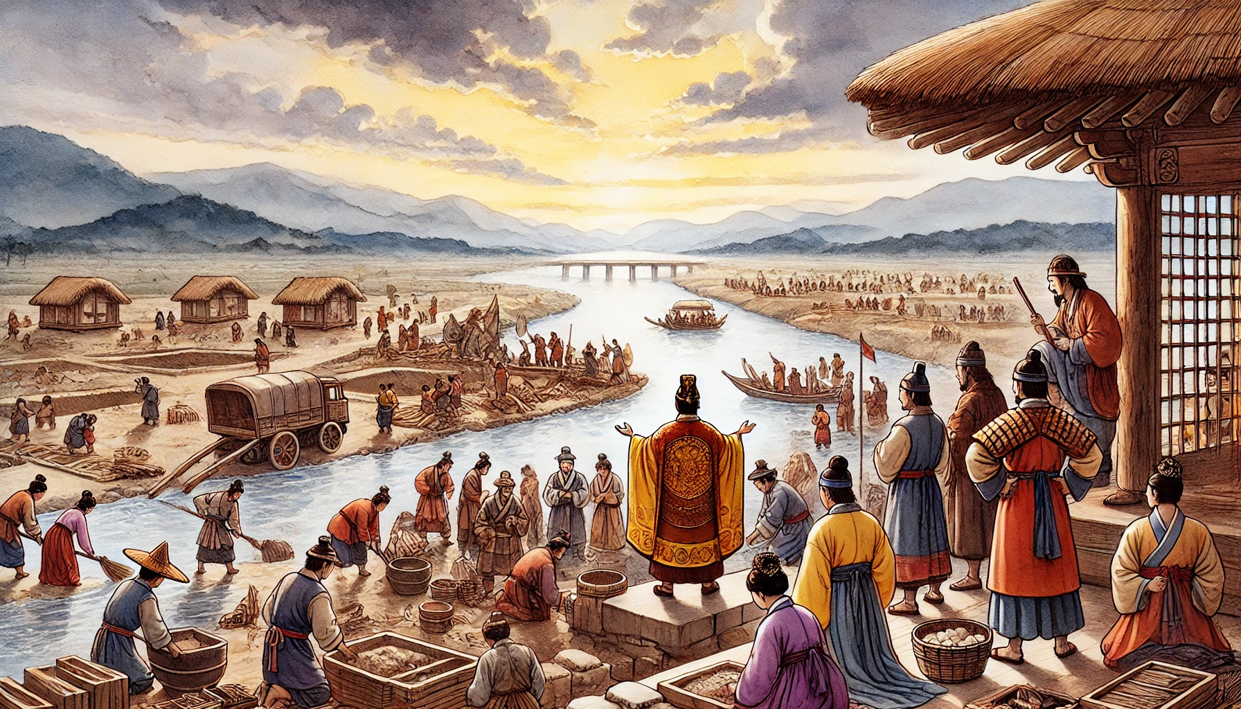 어느 날, 온조는 강가를 걸으며 마을의 남자들과 함께 물길을 살폈다. 그들은 강물을 농경지로 끌어오기 위해 물길을 새로 내야 했다. 하지만 물길을 돌리는 것은 쉽지 않은 작업이었다. 며칠 밤낮을 고심하던 온조는 드디어 적절한 물길을 찾아냈고, 그것을 따라 수로를 만드는 작업을 시작했다. 백성들은 그의 지시 아래 힘을 합쳐 새로운 농경지를 완성해갔다. 그리고 얼마 지나지 않아, 그들의 땅은 강물이 흐르고 곡식이 자라는 비옥한 들판으로 변하기 시작했다.