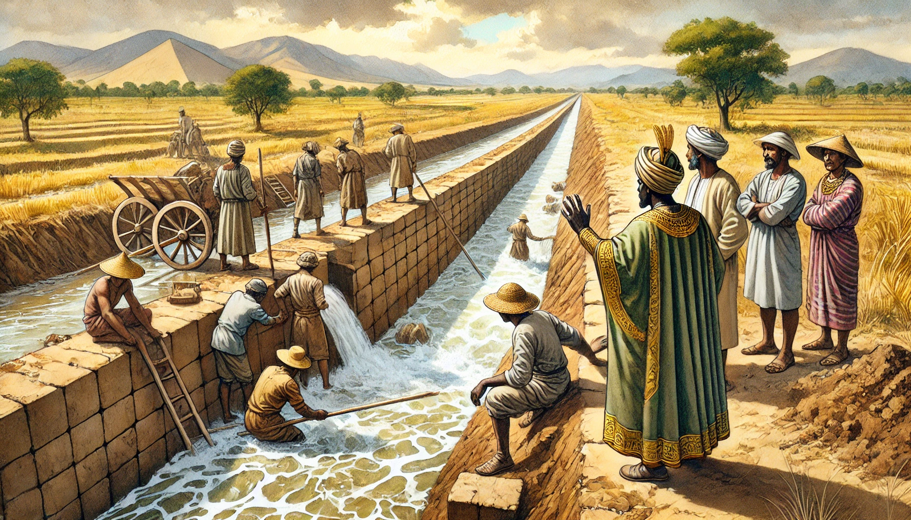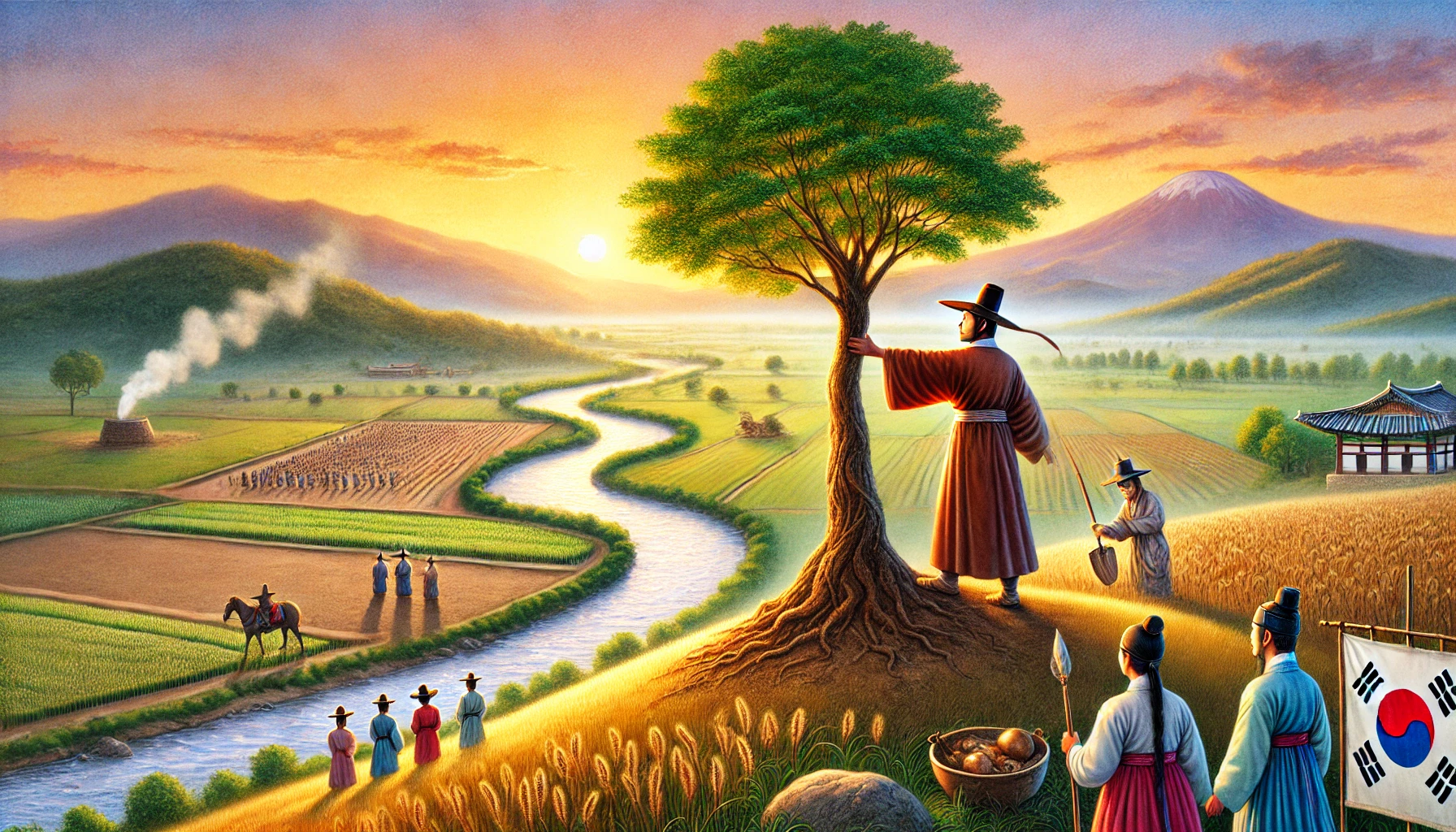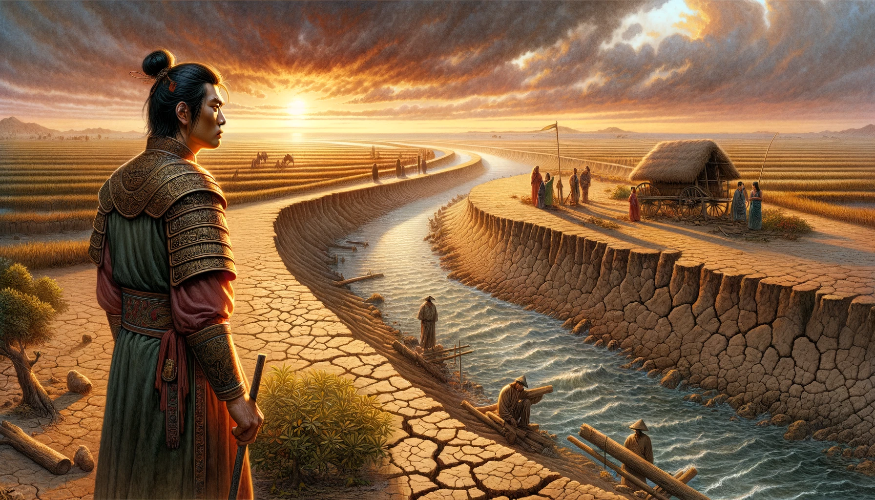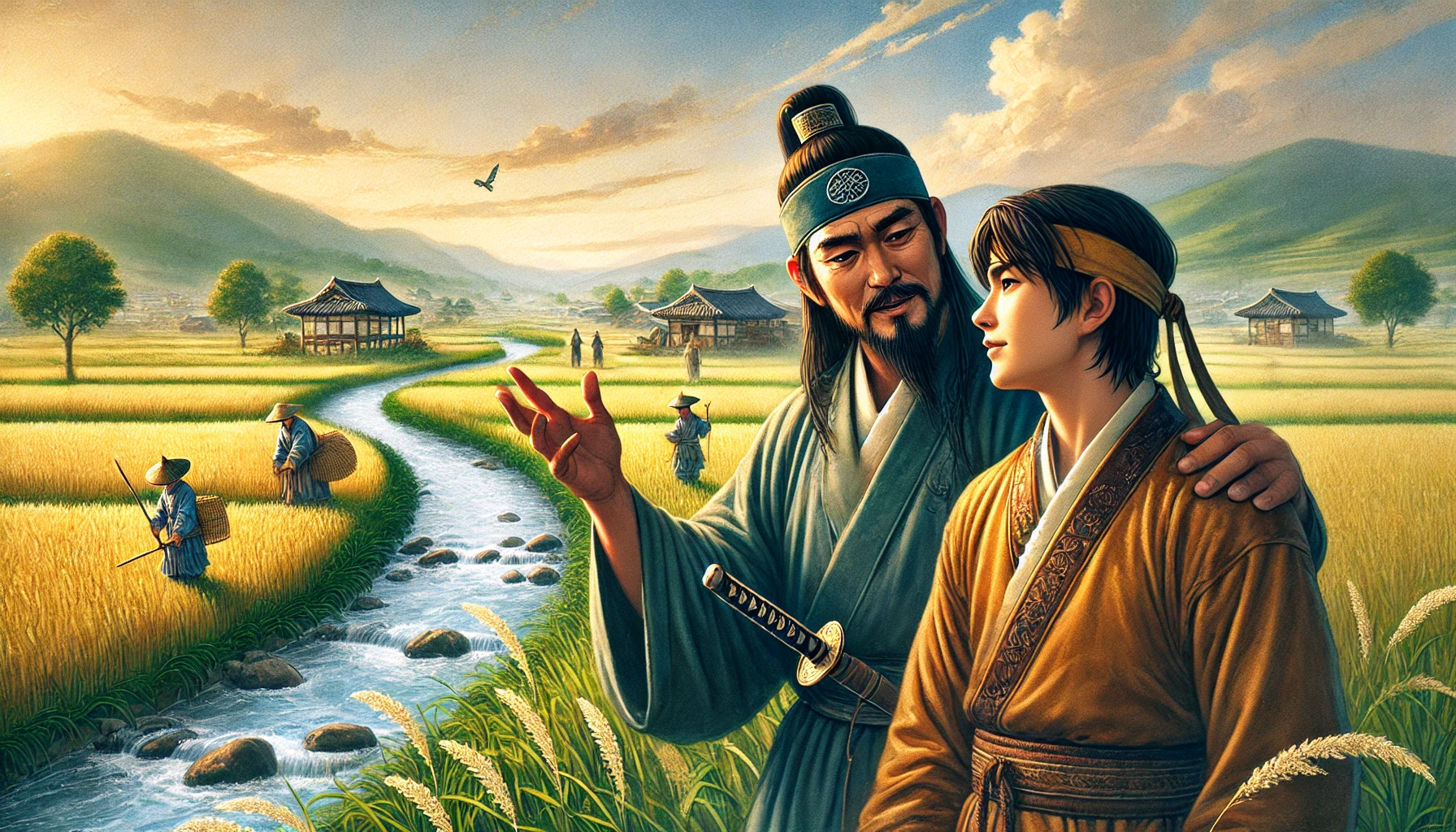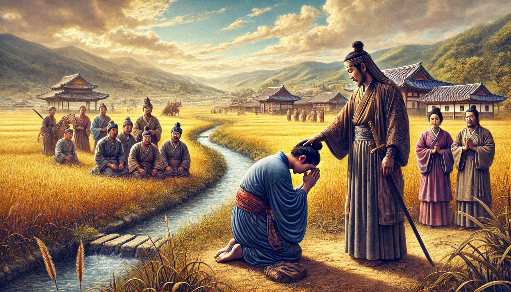 어느 날, 온조는 강가를 걸으며 마을의 남자들과 함께 물길을 살폈다. 그들은 강물을 농경지로 끌어오기 위해 물길을 새로 내야 했다. 하지만 물길을 돌리는 것은 쉽지 않은 작업이었다. 며칠 밤낮을 고심하던 온조는 드디어 적절한 물길을 찾아냈고, 그것을 따라 수로를 만드는 작업을 시작했다. 백성들은 그의 지시 아래 힘을 합쳐 새로운 농경지를 완성해갔다. 그리고 얼마 지나지 않아, 그들의 땅은 강물이 흐르고 곡식이 자라는 비옥한 들판으로 변하기 시작했다.