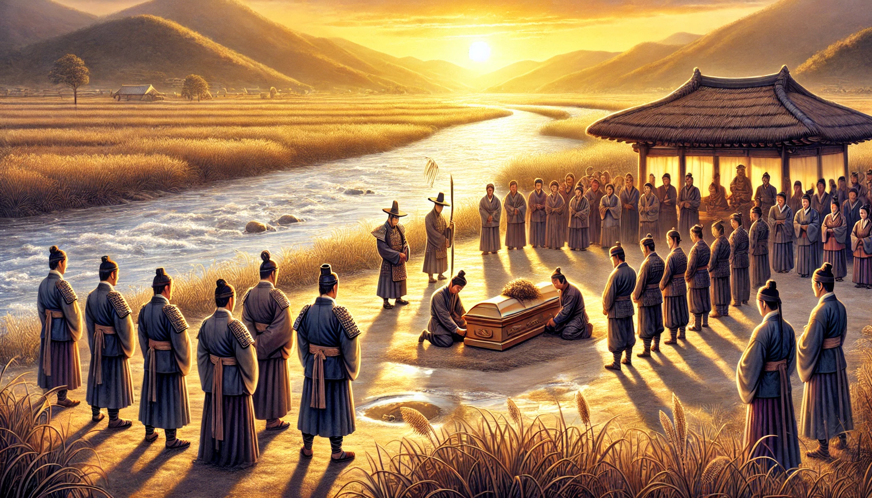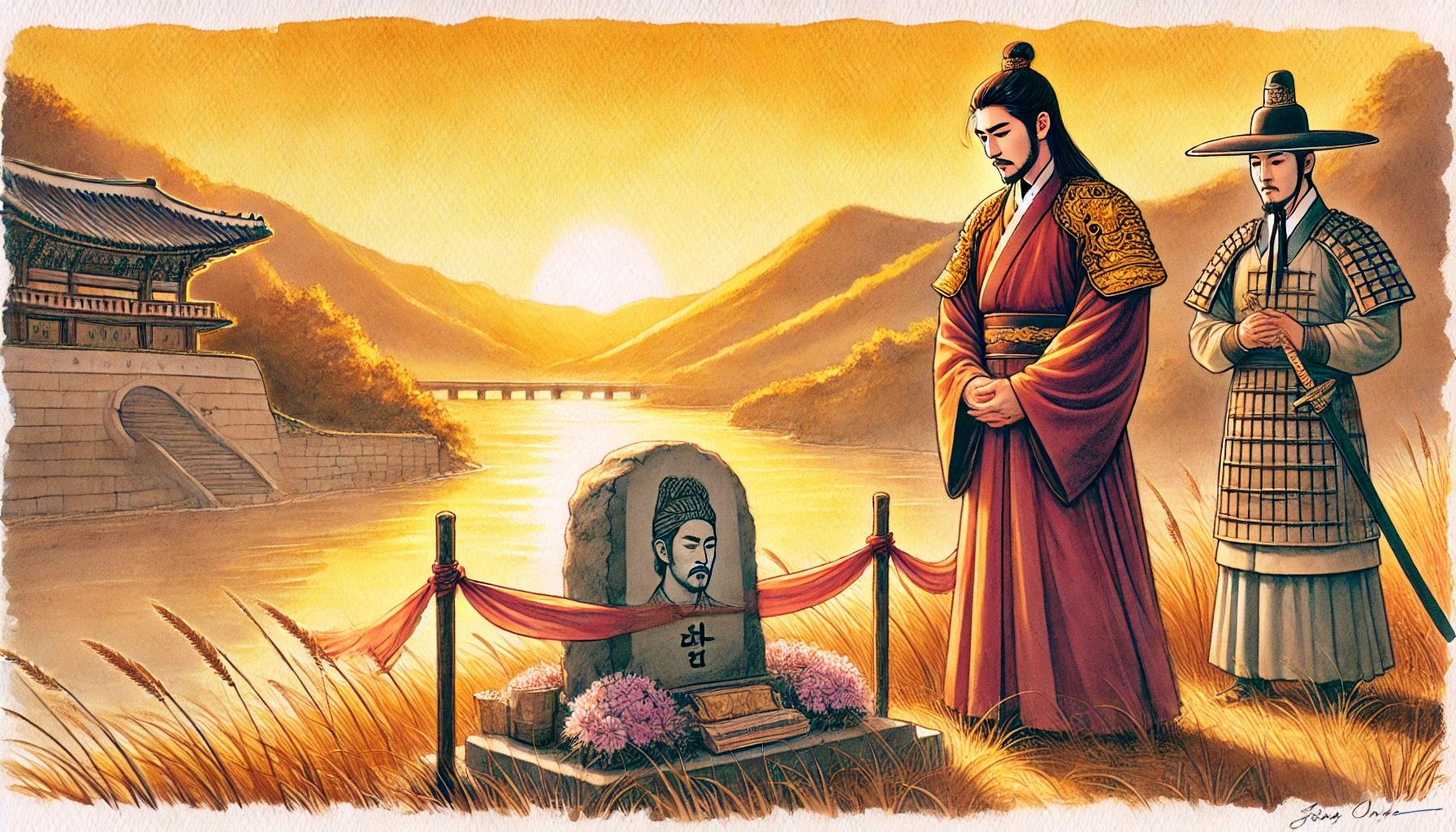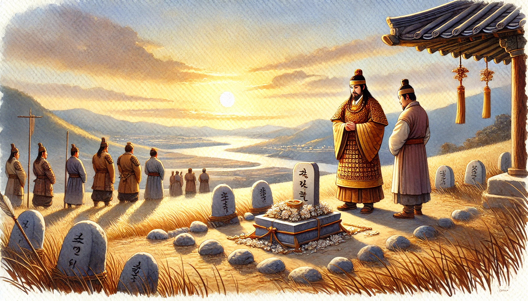 비류의 장례식이 끝난 뒤, 온조는 마을 어귀의 높은 언덕에 올라 한강을 바라보았다. 그의 눈앞에는 풍요로운 들판과 유유히 흐르는 강줄기가 펼쳐져 있었다. 백제의 초석이 놓인 이 땅은 온조와 백성들이 함께 일군 노력의 결실이었다. 그러나 동생 비류의 선택과 희생 또한 지금의 백제를 있게 한 중요한 일부임을 온조는 잘 알고 있었다.