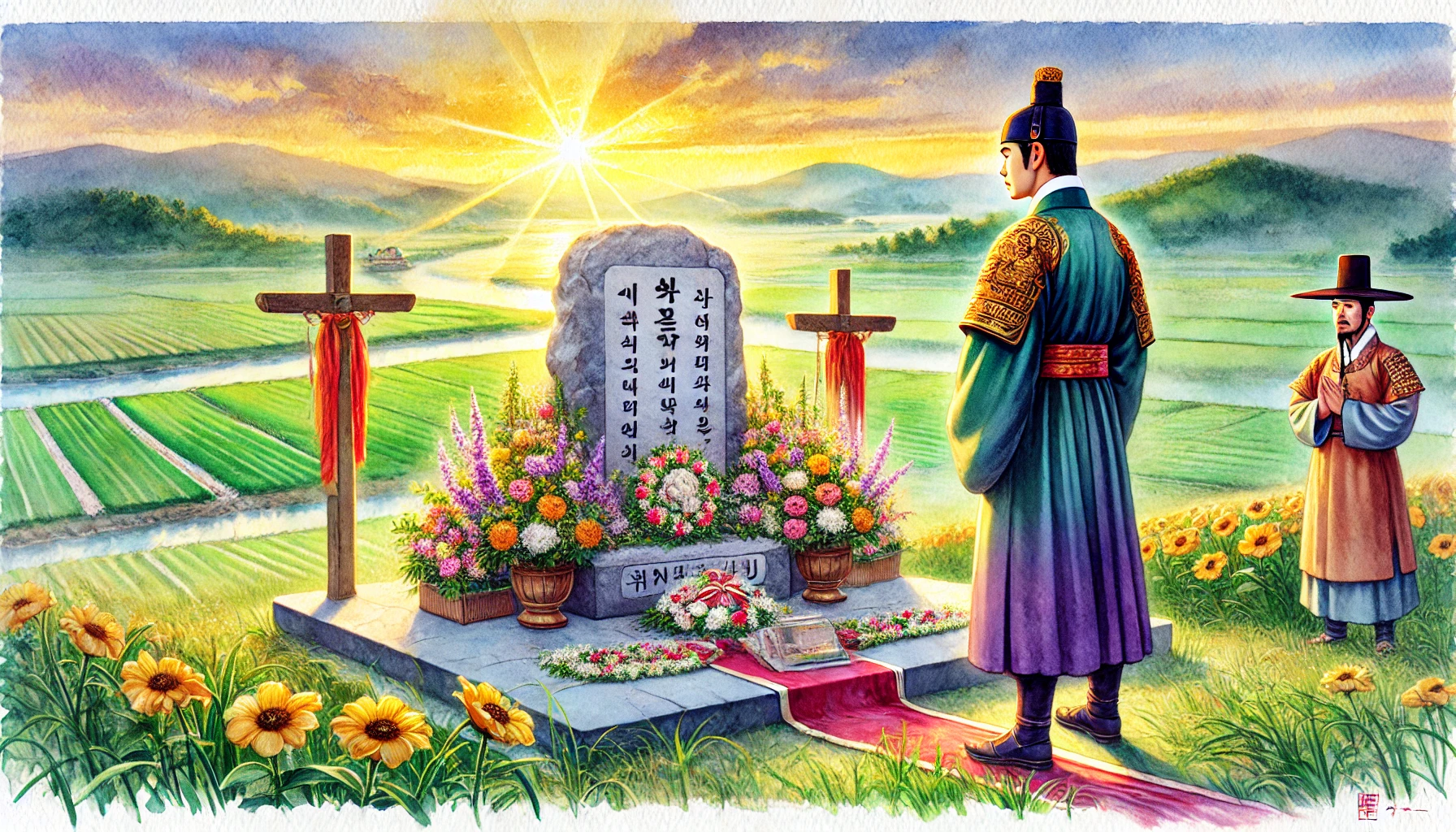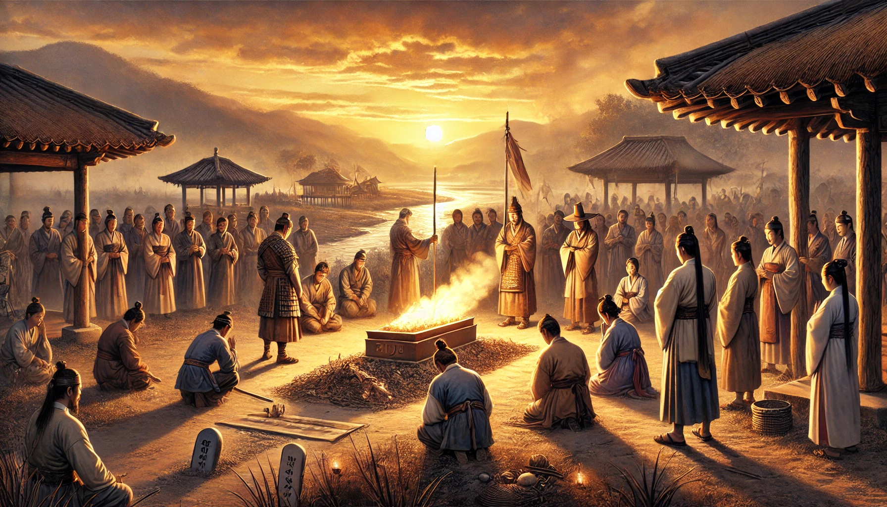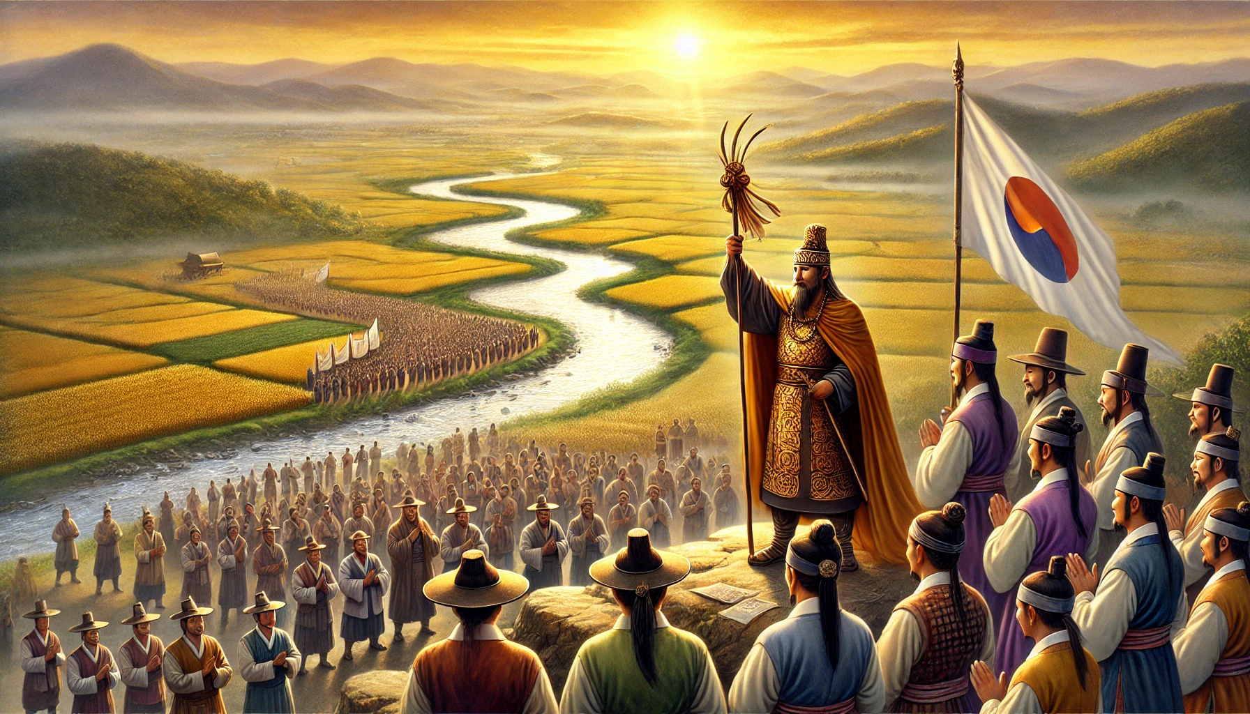 비류의 장례식이 끝난 뒤, 온조는 마을 어귀의 높은 언덕에 올라 한강을 바라보았다. 그의 눈앞에는 풍요로운 들판과 유유히 흐르는 강줄기가 펼쳐져 있었다. 백제의 초석이 놓인 이 땅은 온조와 백성들이 함께 일군 노력의 결실이었다. 그러나 동생 비류의 선택과 희생 또한 지금의 백제를 있게 한 중요한 일부임을 온조는 잘 알고 있었다.