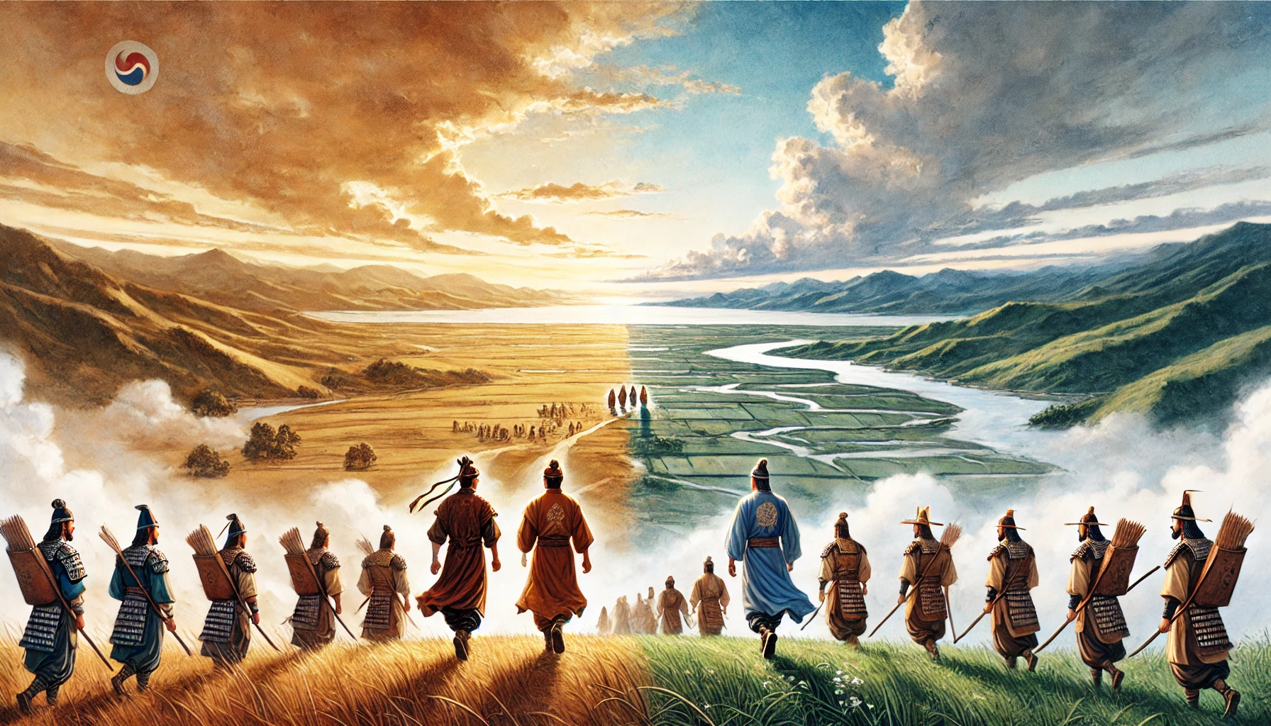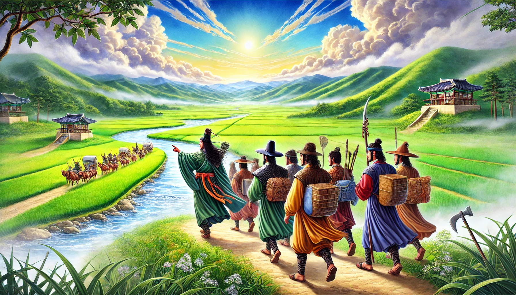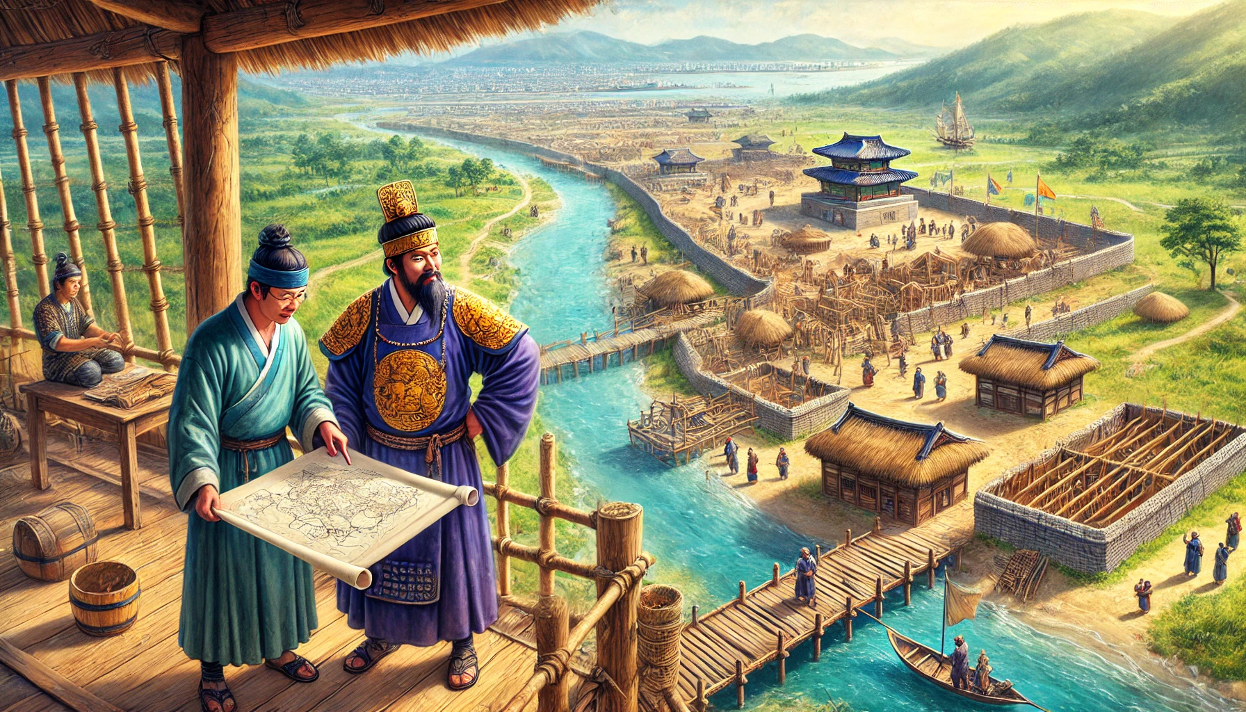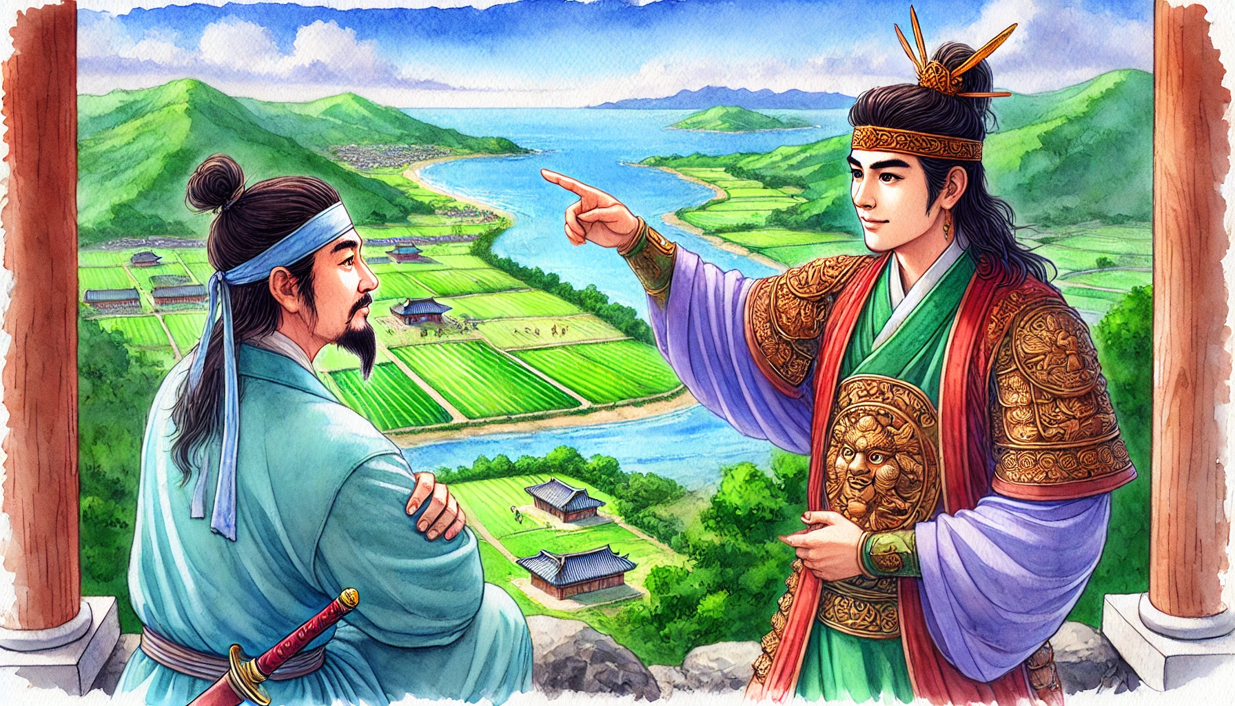 “형, 저기 멀리 보이는 바다 쪽으로 가보자. 저곳이야말로 우리가 꿈꿨던 새로운 나라를 세울 곳일 거야. 물길이 열려 있으니 교역도 활발할 테고, 바다가 우리를 지켜줄 거야.”