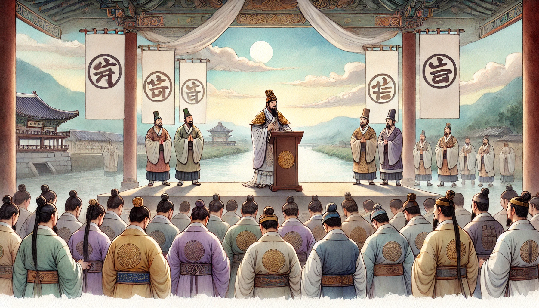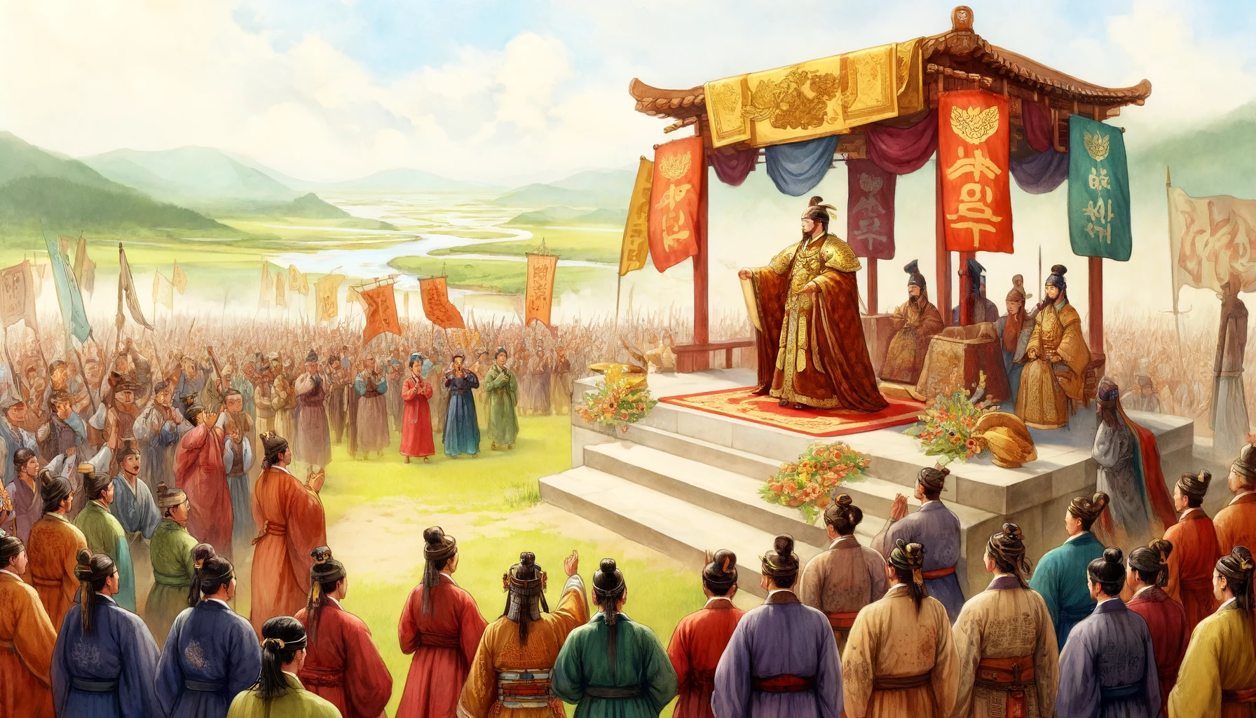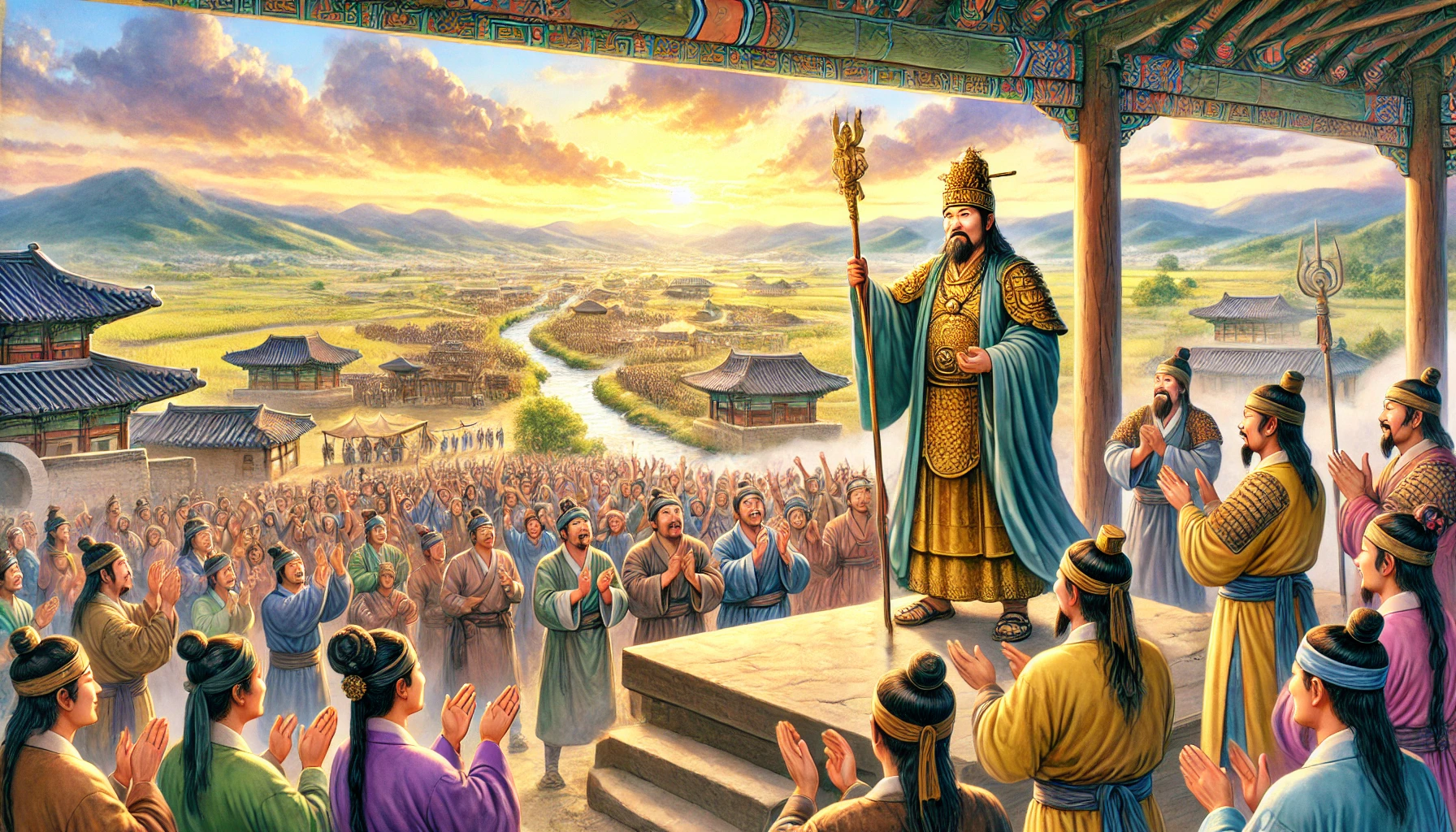 그는 백성을 모아 성대한 의식을 열었다. 이 의식에서 온조는 공식적으로 백제의 왕으로 선포되었고, 백제라는 이름은 이 땅에 살아가는 모든 이들에게 새로운 희망과 자부심을 안겨주었다. 사람들은 왕으로서의 온조를 존경하며 그의 결단과 리더십을 칭송했다.