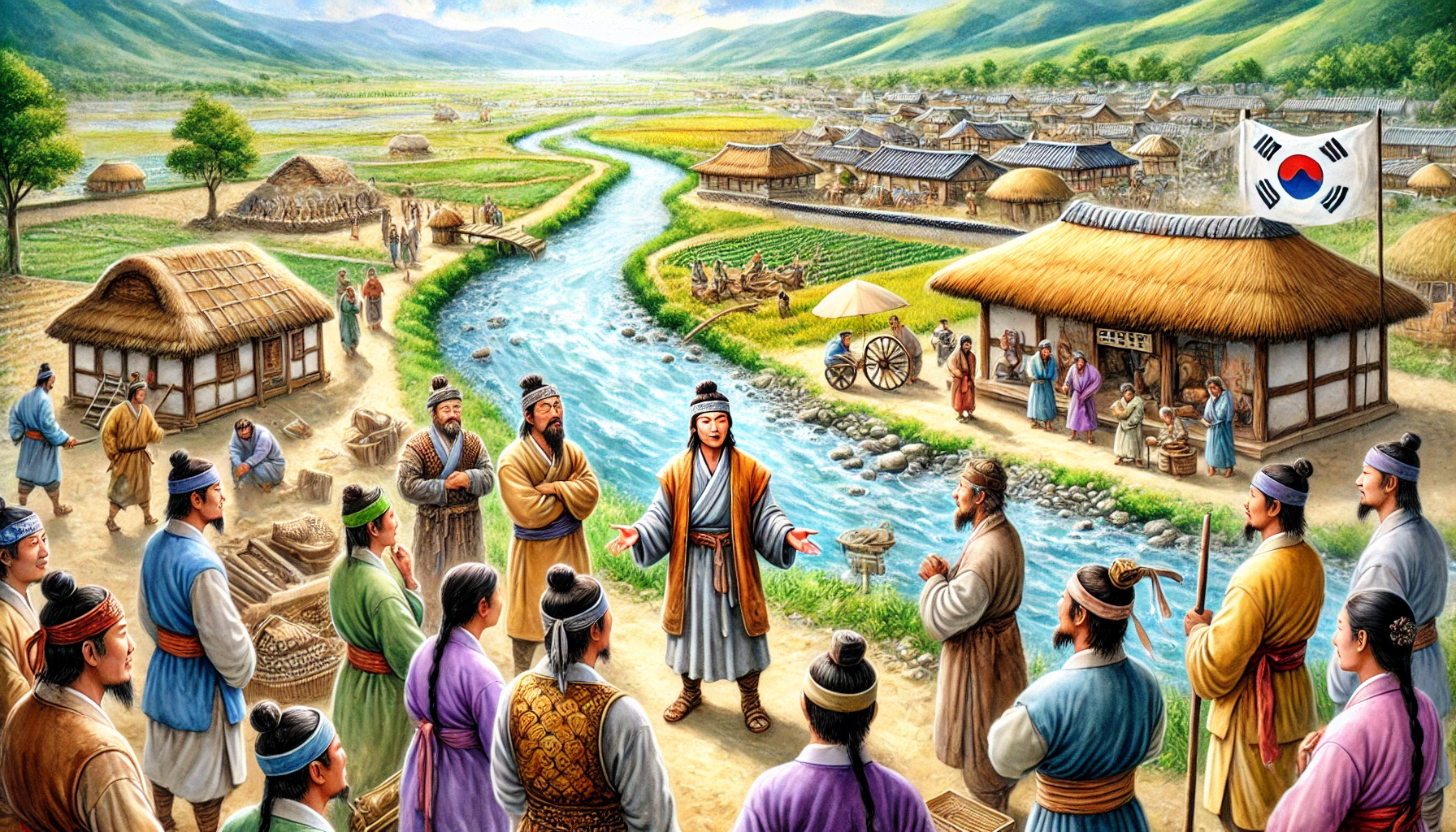 온조와 그의 무리는 한강 유역에 도착했다. 그곳은 온조가 상상했던 대로 물이 풍부하고 땅이 비옥했다. 강줄기는 마치 생명력을 품고 흐르는 듯했고, 주변의 넓은 들판은 농사를 짓기에 적합해 보였다. 온조는 그 땅을 바라보며 생각했다. ‘여기라면 사람들과 함께 새로운 나라를 세울 수 있겠다.’