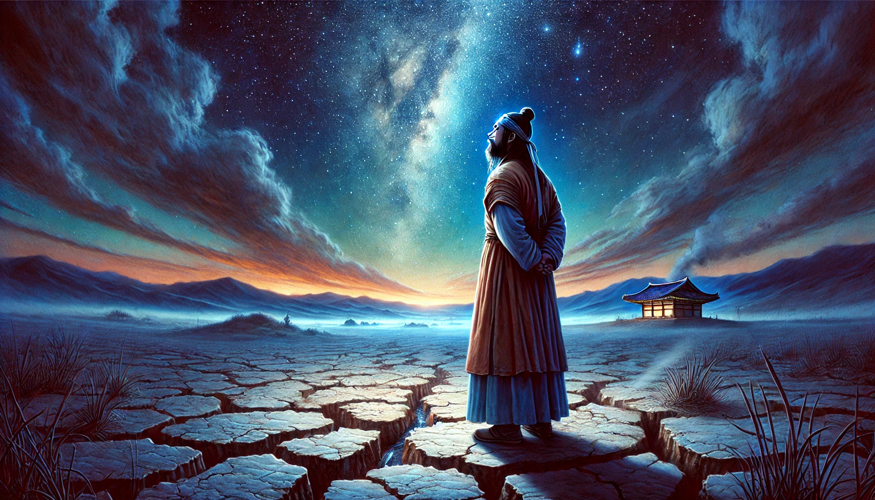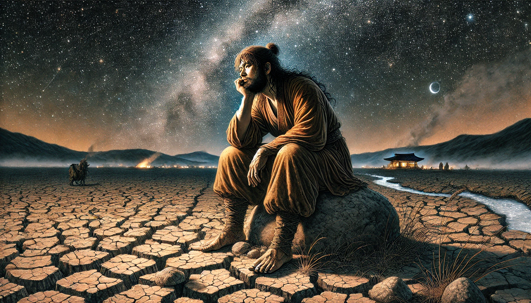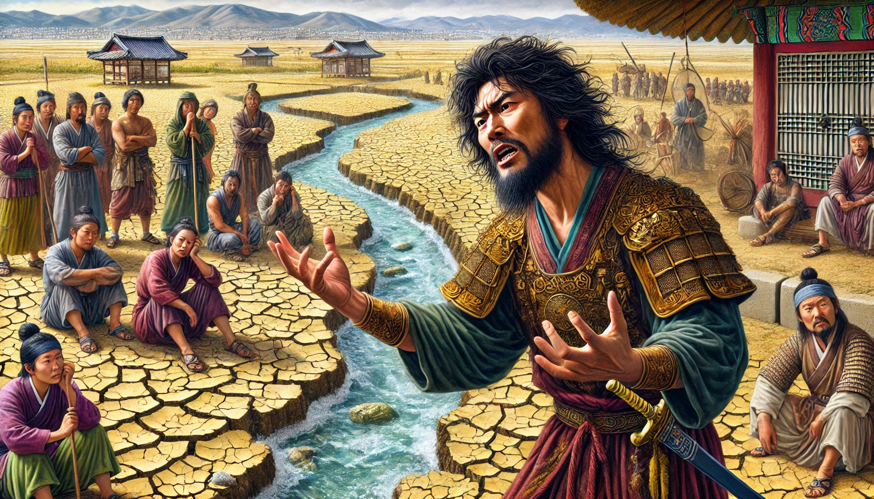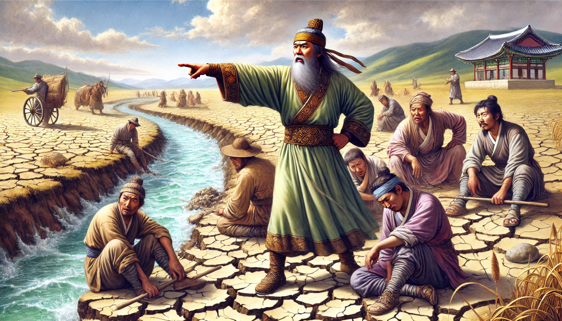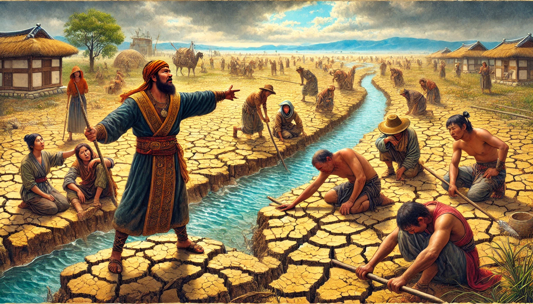 그러나 미추홀은 비류의 예상과는 달랐습니다. 땅은 척박했고, 물이 제대로 나지 않아 농사를 짓는 일이 쉽지 않았습니다. 매일같이 마실 물조차 확보하기 위해 강과 샘을 찾아 헤매야 했습니다. 비류는 처음에는 자신감에 찬 모습으로 사람들을 이끌었지만, 점점 그의 목소리는 날카롭고 짜증 섞인 톤으로 변하기 시작했습니다.
