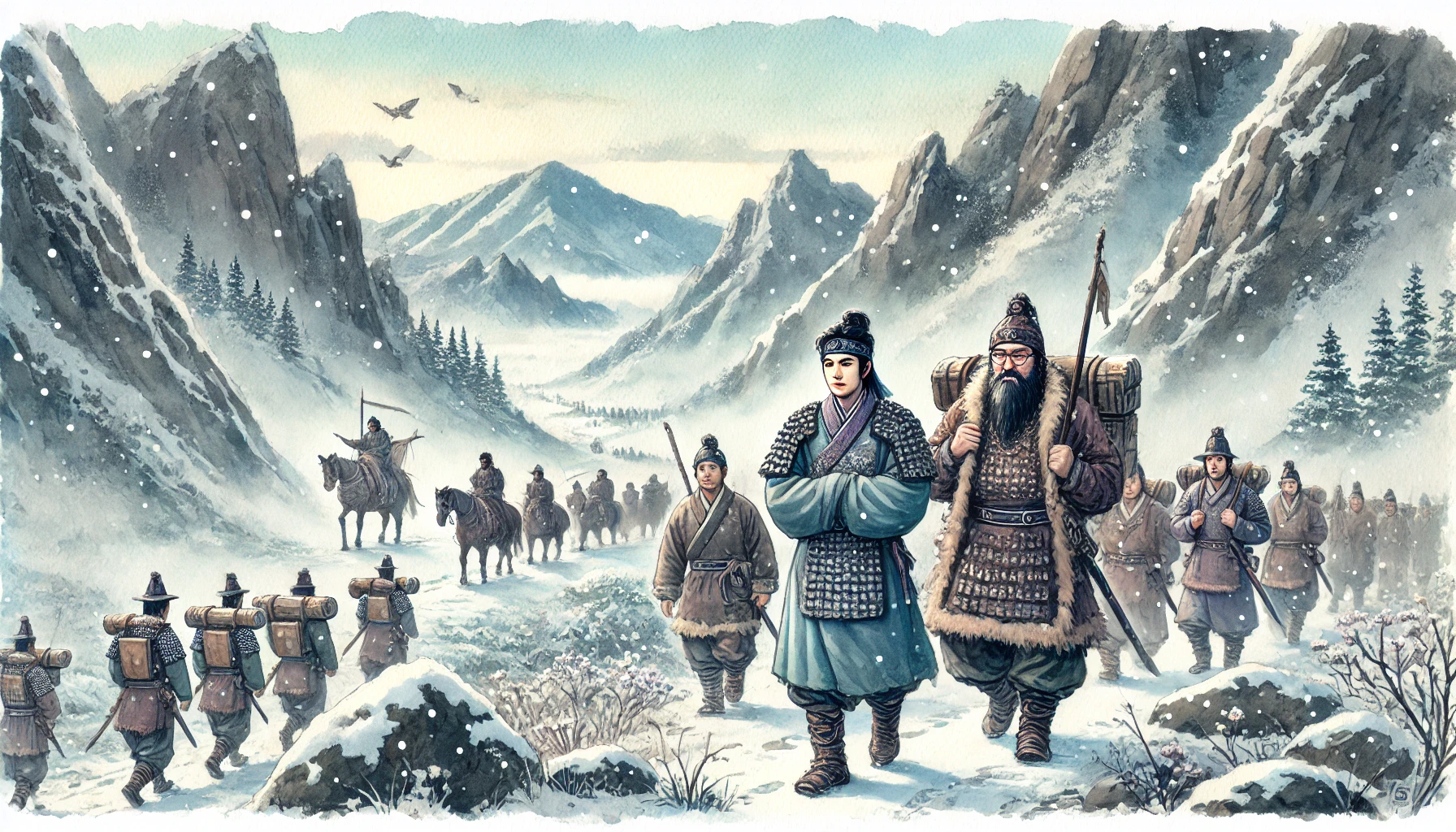온조와 비류는 각자 무리를 이끌고 고구려를 떠나 남쪽으로 향했습니다. 겨울의 매서운 바람 속에서도 그들의 발걸음은 멈추지 않았습니다. 길은 험난했지만, 새로운 땅을 향한 기대와 설렘이 그들을 앞으로 나아가게 했습니다. 길을 따라가는 동안 온조와 비류는 종종 대화를 나누며 앞으로의 계획을 이야기하곤 했습니다. 하지만 점점 그들의 의견은 갈라지기 시작했습니다.