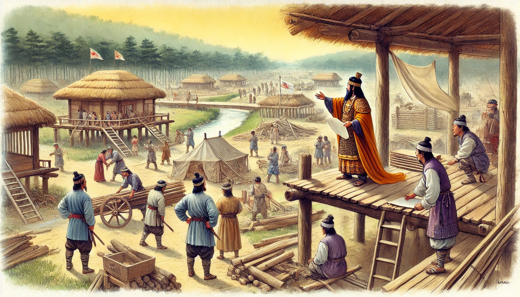 정착 초기의 삶은 녹록지 않았다. 사람들은 강가에 오두막을 세우고, 땅을 개간하며 농사를 준비했다. 낮에는 나무를 베고 땅을 일구었고, 밤에는 모닥불 주위에 모여 온조의 지시를 기다렸다. 온조는 무리 하나하나의 말을 귀 기울여 듣고, 마을의 질서를 잡아가기 시작했다. 그는 누구보다 앞장서서 일을 도왔고, 백성들과 함께 땀을 흘렸다. 이런 그의 모습은 사람들에게 신뢰를 주었다.