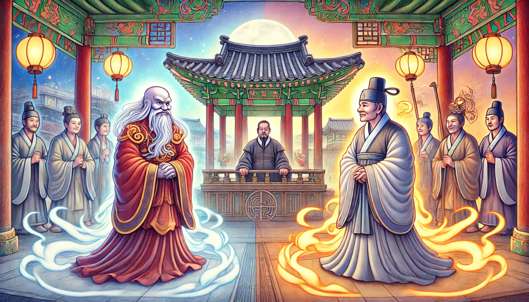 저승으로 끌려온 두 영혼은 거대한 심판대 앞에 섰다. 심판대의 중심에는 웅장한 자태의 염라대왕이 앉아 있었다. 그의 눈빛은 천지를 꿰뚫는 듯 차갑고 단호했다.