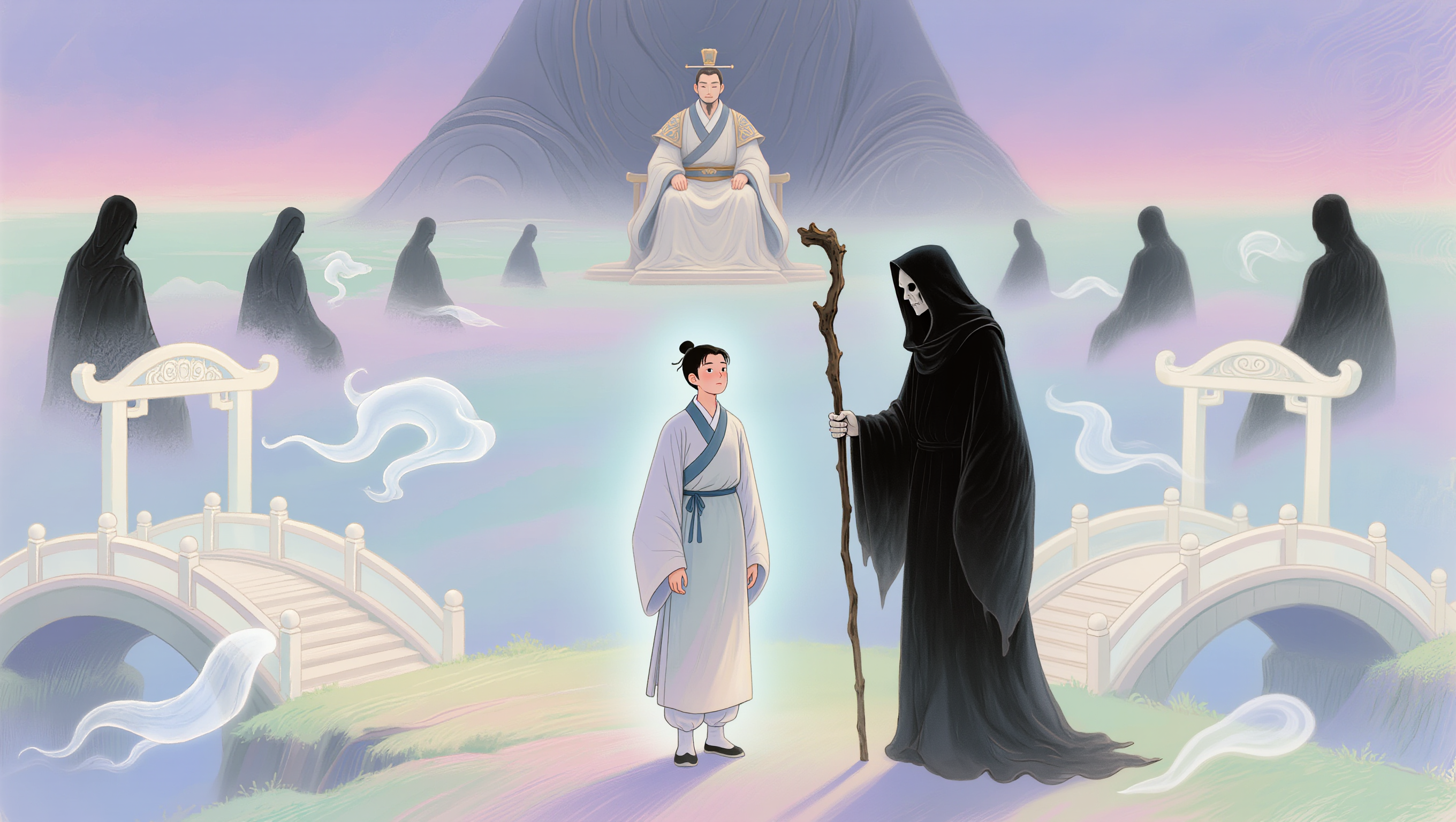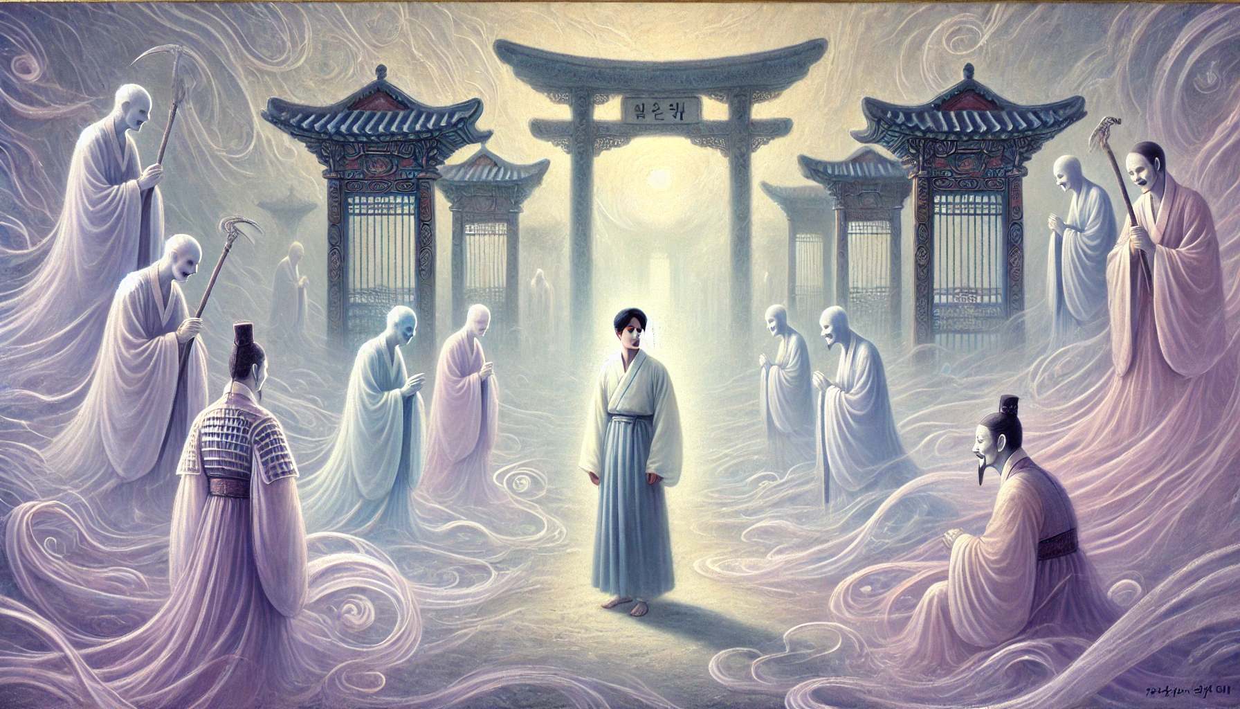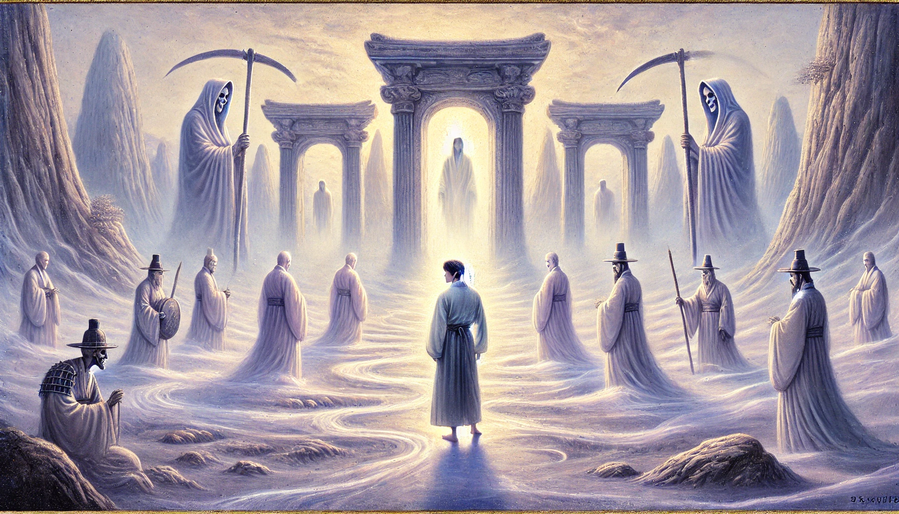 조선 어느 한적한 시골 마을, 김천명이라 불리는 글공부하는 선비가 살고 있었다. 이름은 '하늘의 명'이었으나, 그의 삶은 가난하고 소박했다. 허나 천명은 불평 한마디 없었다. 그에게는 현명한 아내와 눈에 넣어도 아프지 않을 어린 아들이 있었기 때문이다. 그날도 여느 때와 다름없는 평화로운 오후였다. 천명은 낡은 서책을 펼쳐 들고 글을 읽고 있었고, 아내는 마당에서 절구질을, 아이는 그 곁에서 흙장난을 치고 있었다. "하늘 천, 따 지..." 천명의 나지막한 글 읽는 소리가 담장을 넘어갈 무렵, 별안간 사방이 싸늘해졌다. 여름날의 볕이 무색하게 등줄기로 차가운 한기가 스몄다. 천명은 고개를 들었다. 방안에 언제 들어왔는지 모를 검은 그림자가 드리워져 있었다. 그림자가 아니었다. 검은 도포에 갓을 쓴, 창백하다 못해 푸른빛이 도는 사내 둘이 그를 내려다보고 있었다. 저승사자였다. 천명은 입을 열려 했으나 소리가 나오지 않았다. 몸이 마치 돌처럼 굳어버렸다. 사자 중 하나가 아무런 감정 없는 목소리로 말했다. "때가 되었다. 가자." 쇠사슬이 날아와 천명의 몸을 옭아맸다. 그는 비명을 지르려 했으나, 그 소리는 이승의 누구에게도 닿지 못했다. "아니, 왜... 내가 왜...!" 마당의 아내와 아들이 눈에 들어왔다. 그는 필사적으로 발버둥 쳤지만, 사자들의 힘을 당해낼 수는 없었다. 육신에서 영혼이 뽑혀 나오는 고통과 함께, 그의 눈앞이 암전 되었다. 사방은 안개로 자욱했고, 발밑에서는 수많은 원혼의 신음 소리가 들려왔다. 얼마나 걸었을까. 그는 춥고, 배고프고, 두려웠다. 앞서가는 사자들은 단 한마디의 말도, 한 번의 뒤돌아봄도 없었다. 그저 묵묵히 그를 끌고 갈 뿐이었다. 끝도 보이지 않는 어둠의 강, 황천을 건넜을 때, 저 멀리 거대하고 위압적인 문이 나타났다. '시왕전'. 저승의 문이었다. 천명은 자신이 죽었다는 것을, 그리고 아무런 준비도 없이 이 낯선 곳에 떨어졌다는 것을 비로소 실감하며 절망했다.