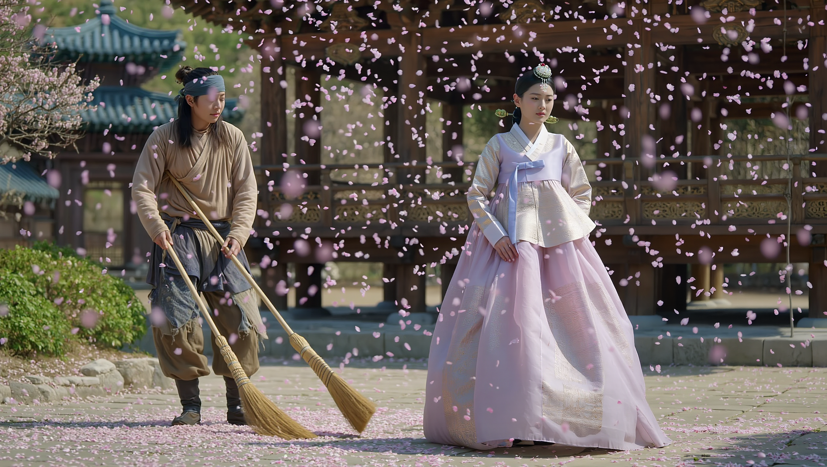 Image Prompt: A grand Joseon Dynasty estate in spring. Cherry blossoms are falling like snow. In the courtyard, a beautiful noblewoman (Lady Yeon-hwa) stands on a veranda, looking down with a melancholic expression. Below, a blind servant in tattered clothes is sweeping the yard with a broom, moving with strange grace despite his blindness. Cinematic lighting, high contrast between the lady's silk dress and the servant's rags.