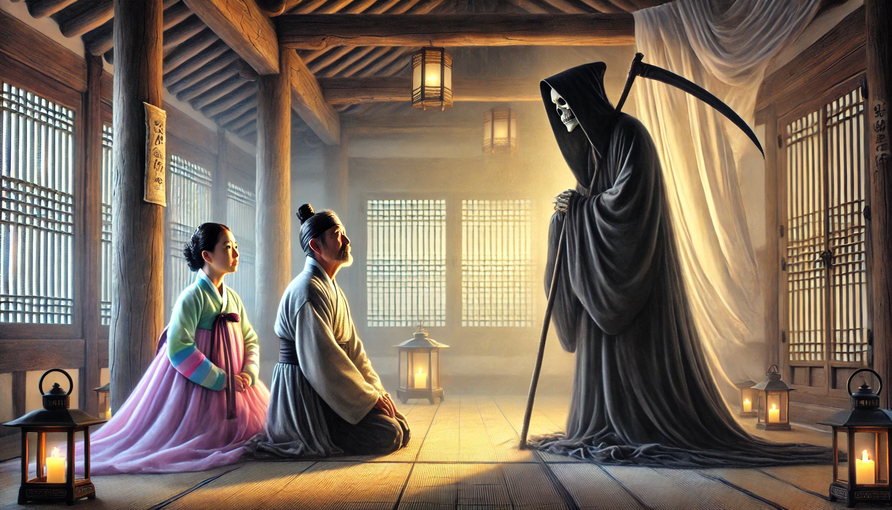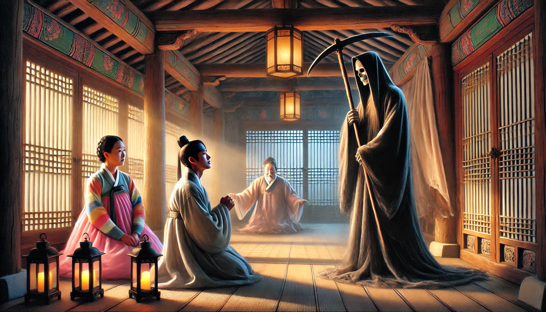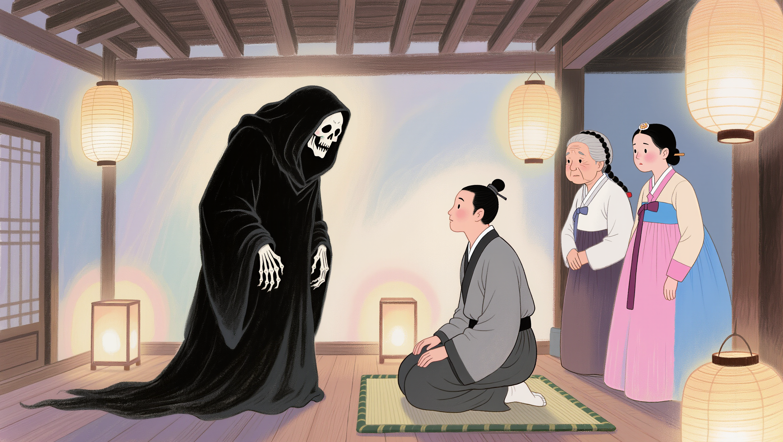김성운의 얼굴이 새하얗게 질렸습니다. "뭐, 뭐라고 하셨소? 어머니와 아내 중 한 분이 돌아가신다고?" 저승사자는 차갑게 고개를 끄덕였습니다. "그렇다. 염라대왕의 장부에 그렇게 기록되어 있다."