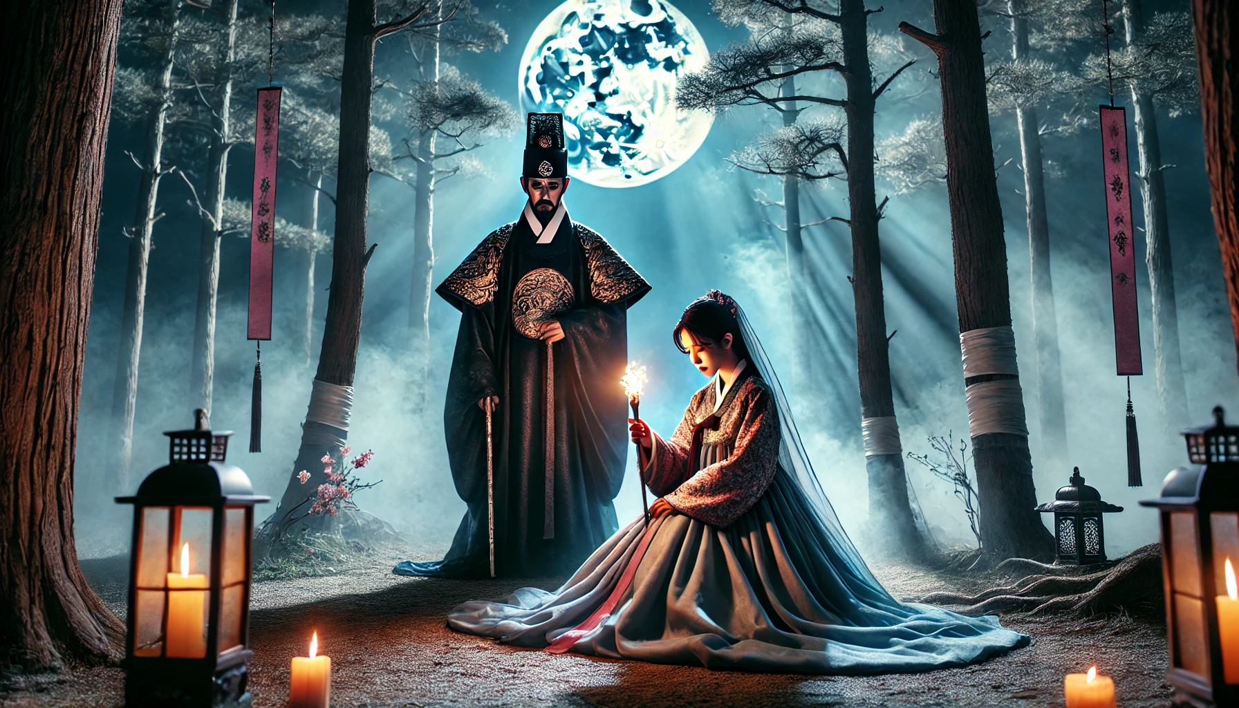 그날 밤, 그녀는 보름달이 환히 비추는 숲의 깊은 곳으로 걸음을 옮겼다. 빽빽한 나무들 사이로 희미하게 들리는 바람 소리가 그녀의 불안한 마음을 더 자극했다. 손에는 어머니를 위한 기도와 함께 거문고를 들고 있었다. 그녀는 그동안 거문고를 연주하며 마음을 다잡았지만, 오늘 밤의 연주는 저승의 문을 여는 열쇠가 될지도 모른다는 생각에 온몸이 떨렸다.
