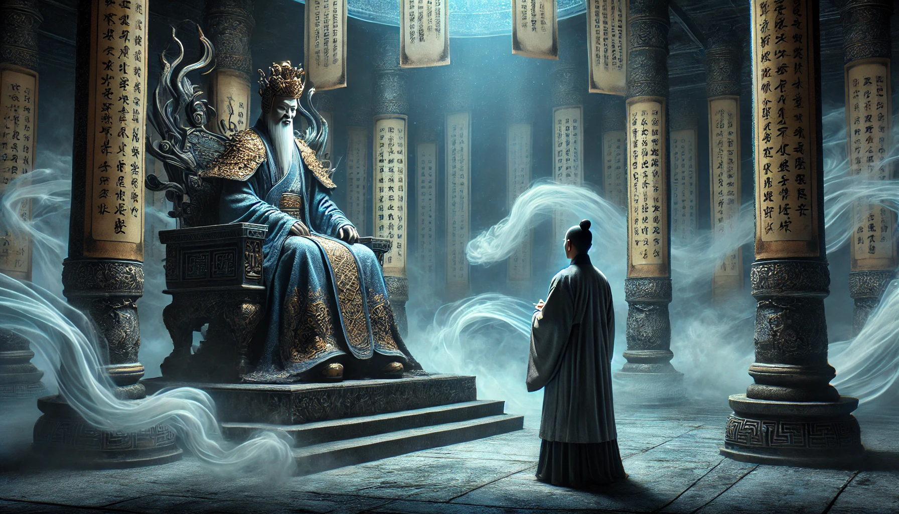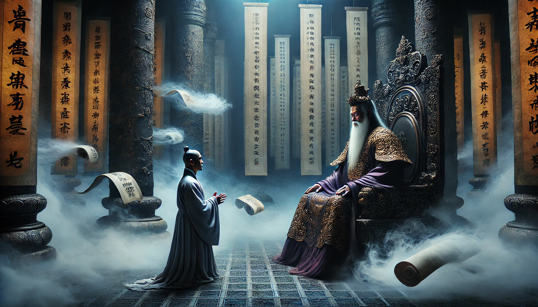 한 권의 두꺼운 사자부(死者簿)가 차가운 대리석 탁자 위에 펼쳐졌다. 거대한 옥좌에 앉아 있는 자, 바로 저승을 관장하는 염라대왕이었다. 그의 눈동자는 한 치의 흔들림 없이 오직 사자부의 내용을 읽어 내려갔다.