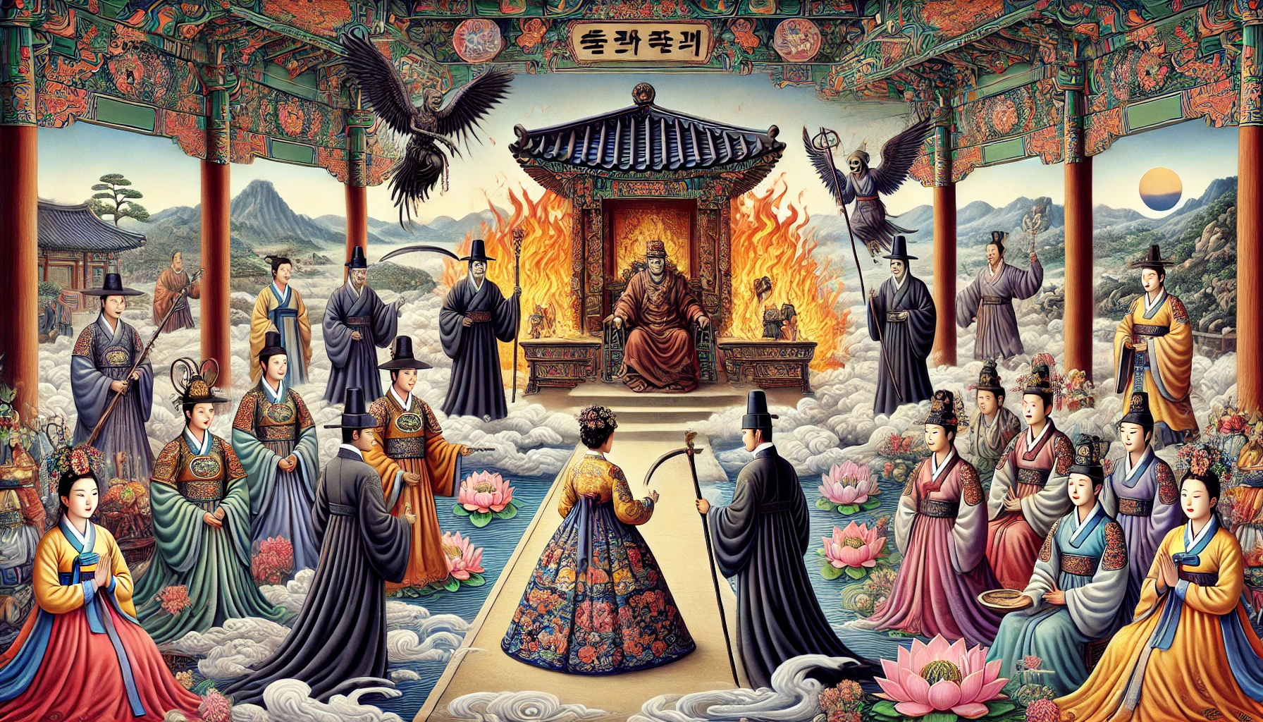 문이 서서히 열리자, 그들은 그 안으로 들어섰다. 안쪽에는 수많은 영혼들이 줄지어 서 있었다. 모두 염라대왕의 심판을 기다리는 망자들이었다.