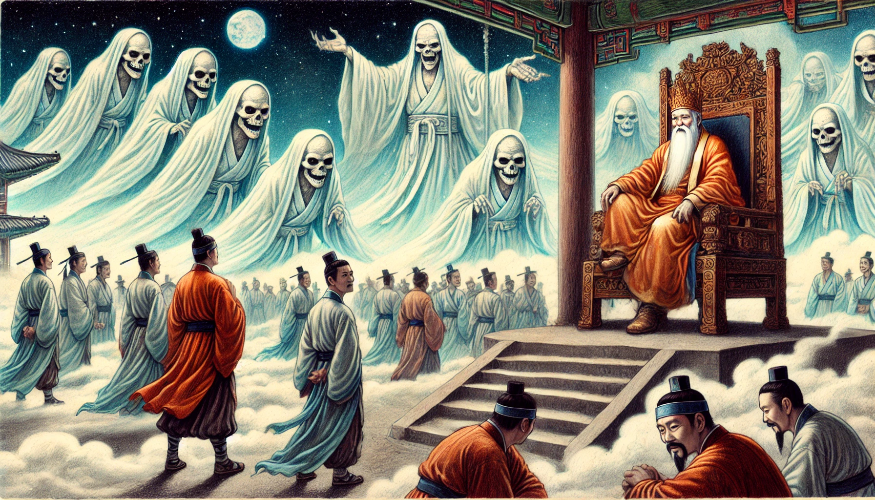 염라대왕의 우렁찬 목소리가 지옥 전체를 뒤흔들었습니다. 그 앞에는 인간 세상의 모든 일을 기록하는 판관들이 두려운 표정으로 엎드려 있었어요.