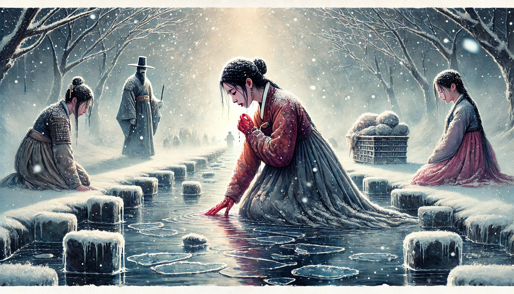 시어머니의 등살에 떠밀려 분이는 무거운 빨래 광주리를 머리에 이고 냇가로 향했습니다. 밖은 이미 세상이 꽁꽁 얼어붙어 발을 뗄 때마다 '뽀드득 뽀드득' 눈 밟는 소리만 가득했고, 입김을 불면 금세 고드름이 될 것처럼 공기가 차가웠습니다. 분이는 홑겹 저고리 위로 낡은 누비배자를 껴입었지만, 뼛속까지 파고드는 한기를 막기엔 역부족이었지요. 냇가에 도착하니 물은 이미 단단한 얼음장에 갇혀 있었습니다. 분이는 가느다란 팔로 무거운 돌멩이를 들어 얼음을 깼습니다. '콰직!' 하고 깨진 얼음 틈으로 차가운 물이 튀어 오르자, 그녀의 붉게 튼 손등은 순식간에 감각이 사라졌습니다.