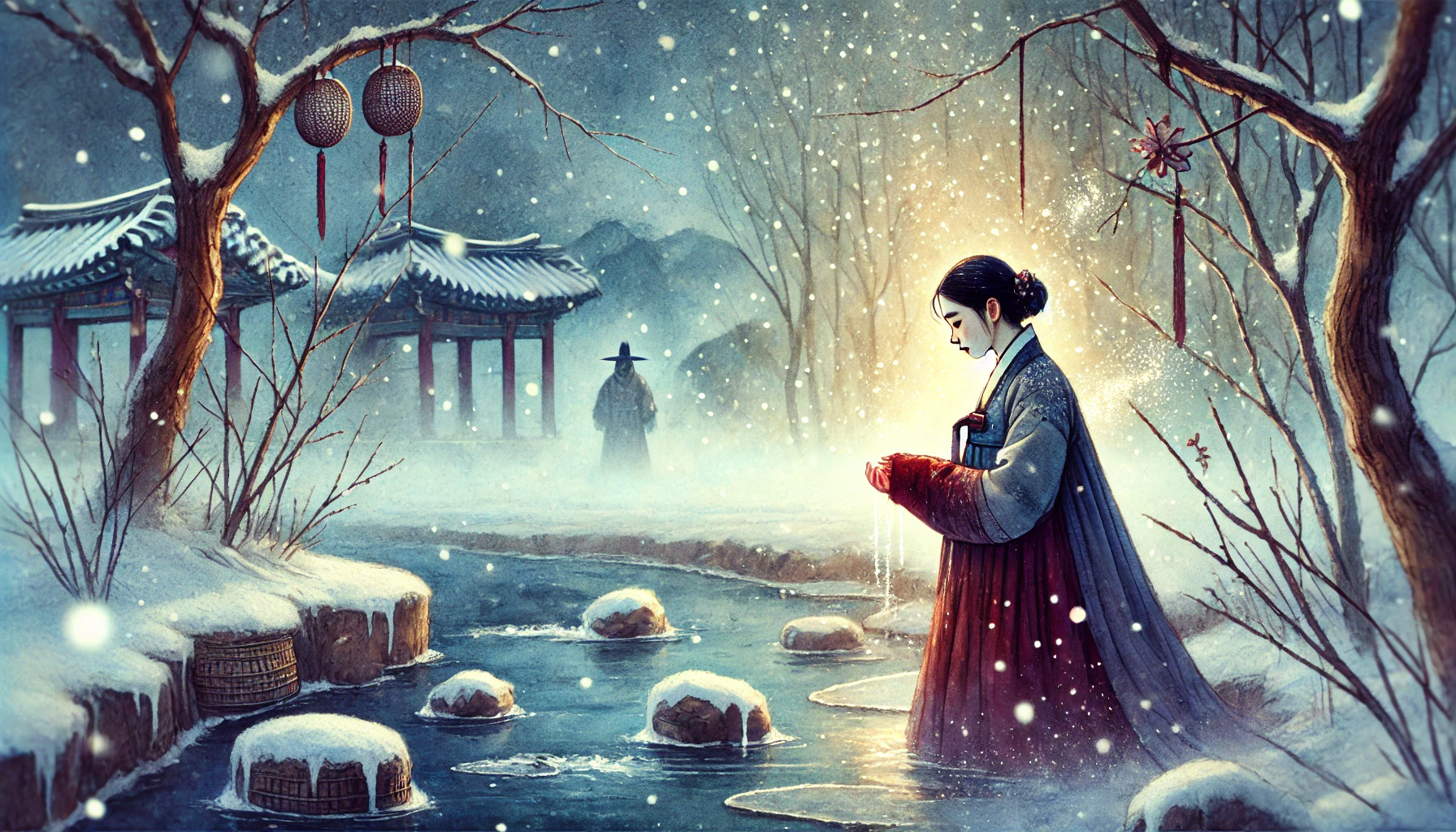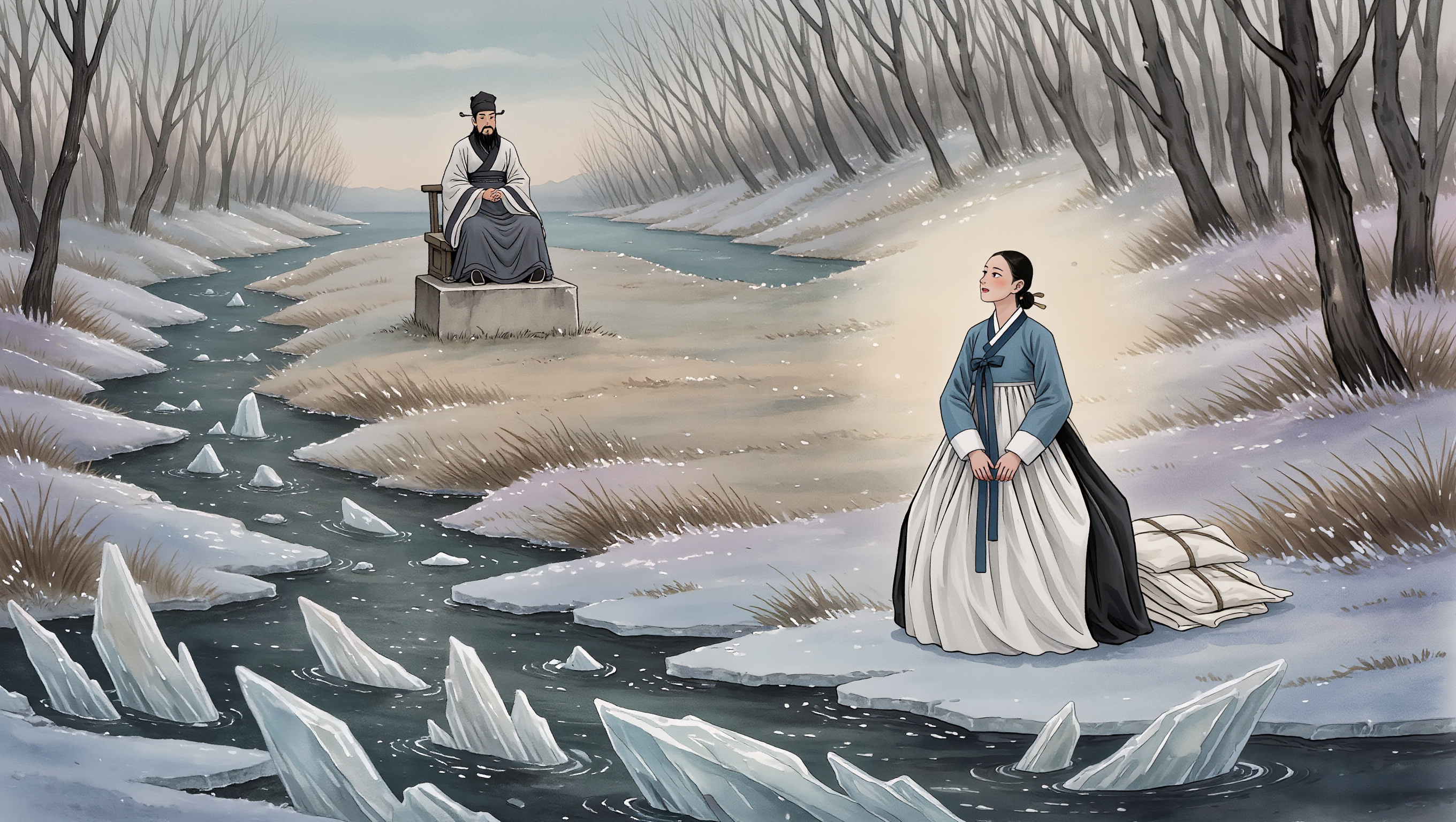 그 순간이었습니다. 빨래를 헹구려고 몸을 앞으로 깊숙이 기울이던 찰나, 며칠을 굶다시피 하며 일에 치여 산 탓에 갑자기 눈앞이 노랗게 변하며 지독한 어지럼증이 덮쳤습니다. "어, 어..." 소리칠 틈도 없이 분이의 발이 젖은 얼음판 위에서 미끄러졌습니다. '풍덩!' 하고 차가운 수면 밑으로 몸이 잠기는 건 순식간이었습니다. 정신을 차려보려 허우적거렸지만, 솜바지 가득 스며든 차가운 물이 천근만근 무게로 그녀를 아래로 끌어내렸습니다. 물속은 고요했고, 오직 자신의 심장이 마지막으로 뛰는 '쿵, 쿵' 소리만 귓가를 울렸습니다.