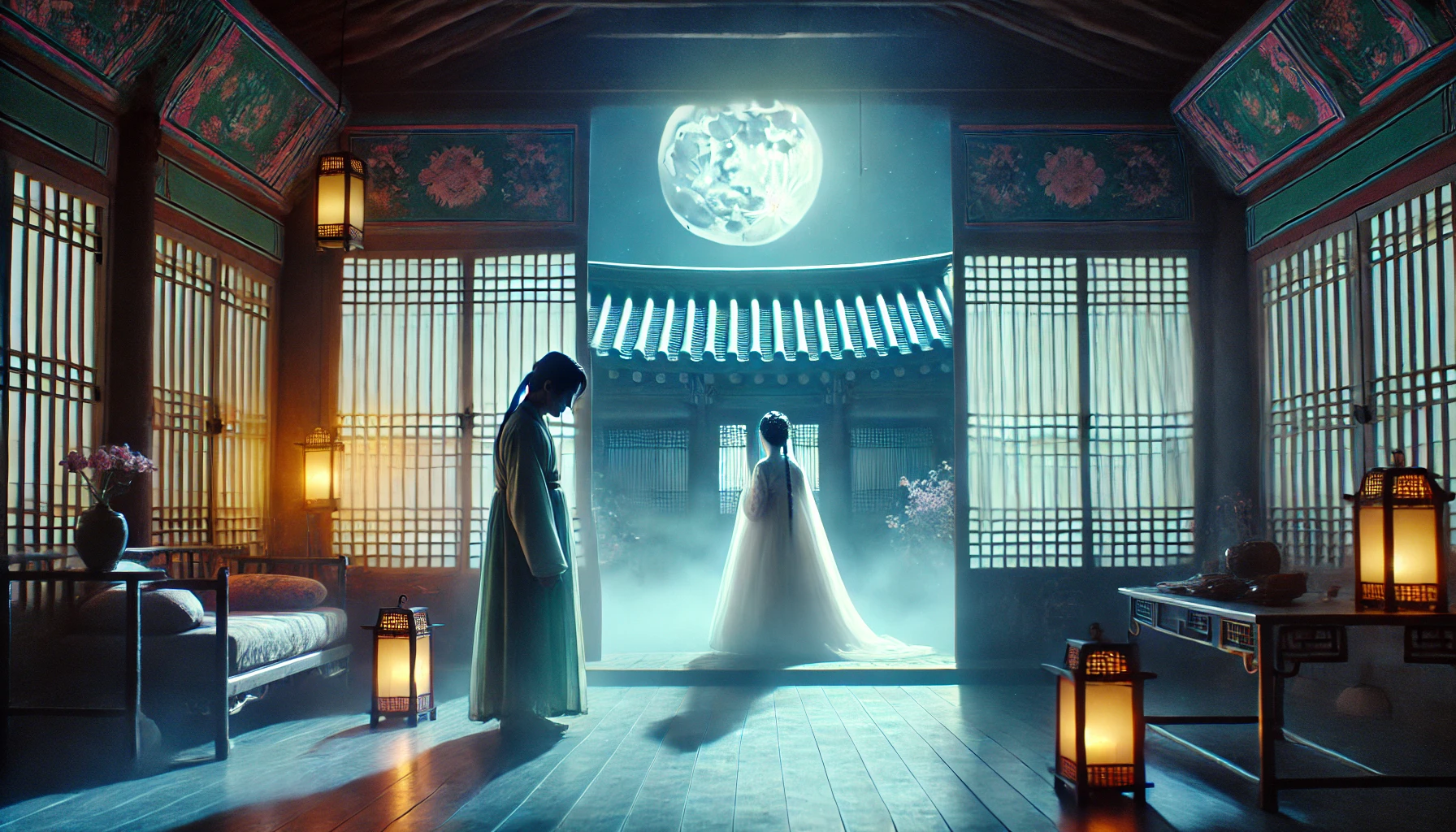 그날 이후, 이선은 기적처럼 생기를 되찾았다. 며칠 전까지만 해도 송장이나 다름없던 사람이, 언제 그랬냐는 듯 말끔하게 세수를 하고 의관을 정제했다. 그는 예전처럼 식사를 했고, 심지어 가벼운 농담까지 던졌다. 이선의 부모는 아들이 드디어 슬픔을 이겨냈다며 기뻐했다. 하지만 그 기쁨은 오래가지 않았다. 아들의 행동에는 어딘가 기이한 구석이 있었다. 이선은 해가 지기 무섭게 자신의 방으로 들어가 문을 걸어 잠갔고, 아침 해가 뜰 때까지 나오지 않았다. 또한 그는 매 끼니마다 자신의 밥상에 수저 한 벌과 빈 그릇을 더 놓아달라고 청했다. "아들아, 어찌하여 빈 그릇을 놓으라는 것이냐?" 노모가 묻자, 이선은 그저 "아닙니다, 어머니. 그저 습관이 되어서 그렇습니다."라며 얼버무릴 뿐이었다. 하지만 방 안에서는 이상한 일들이 벌어졌다. 밤이 깊으면, 이선의 방에서는 두런두런 말소리가 새어 나왔다. 분명 이선 혼자 있는 방인데도, 남자의 목소리와 함께 여자의 가느다란 웃음소리가 섞여 들려오는 듯했다. 집안의 늙은 몸종은 고개를 갸웃거렸다. '도련님이 실성이라도 하신 건가' 호기심을 참지 못한 몸종은 어느 날 밤, 몰래 이선의 방문에 다가가 뚫어진 창호지 구멍으로 안을 엿보았다. 방 안에는 이선이 홀로 앉아 술잔을 기울이고 있었다. 그런데 그의 맞은편 빈자리에도 술잔이 놓여 있었고, 그 잔이 저절로 비워지는 것이 아닌가! 이선은 허공을 향해 다정하게 속삭였다. "부인, 한 잔 더 받으시오. 오늘 밤은 달이 참 밝구려." 그러고는 마치 누군가의 뺨을 쓰다듬듯 허공에 손을 뻗었다. 몸종은 온몸에 소름이 돋았다. 그때였다. 분명 방 안에는 이선 혼자인데도, 호롱불 그림자가 두 개로 나뉘어 흔들리는 것이 보였다. 하나의 그림자는 이선의 것이 분명했으나, 다른 하나의 그림자는 가늘고 긴 여인의 형상이었다! 심지어 몸종은 이선이 그 여인의 그림자를 끌어안고 입을 맞추는 듯한 기괴한 광경을 목격했다. 그림자 두 개가 하나로 겹쳐지며 격렬하게 일렁였고, 방 안에서는 이선의 거친 숨소리와 함께, 이 세상의 것이 아닌 듯한 여인의 교태 섞인 신음소리가 희미하게 새어 나왔다. 그것은 분명, 남녀가 정을 통할 때 나는 소리였다! 몸종은 비명을 지를 뻔한 것을 간신히 참으며 뒷걸음질 쳤다. 방 안에서는 퀴퀴한 흙냄새와 함께, 죽은 옥영 아씨가 쓰던 그 난초 향기가 진하게 풍겨 나오고 있었다. '아씨의 혼령이다! 돌아가신 아씨의 혼령이 도련님의 양기를 빨아먹고 있어!' 몸종은 혼비백산하여 안방으로 달려가 이선의 부모에게 이 사실을 고했다.