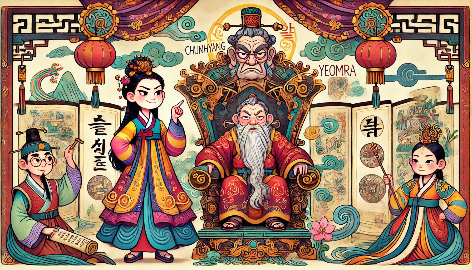 저승의 사자들이 그녀를 끌고 간 곳에는 위엄 넘치는 염라대왕이 앉아 있었다. 커다란 책상 위에는 두루마리와 붓이 놓여 있고, 그의 눈빛은 날카로웠다. 춘향은 당황한 얼굴로 염라대왕을 올려다보며 외쳤다.