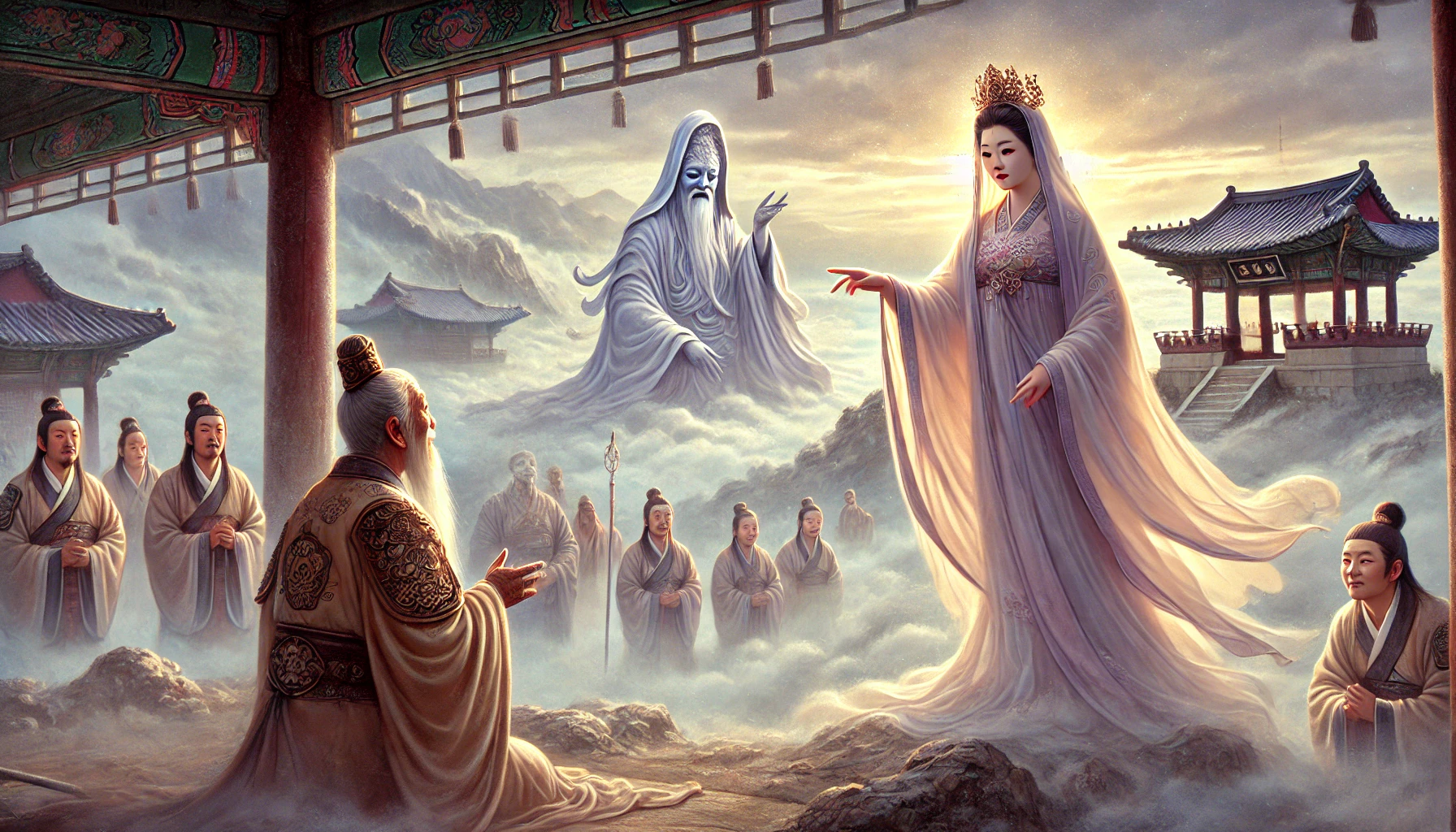 그때였습니다. 법당에 갑자기 환한 빛이 비치더니, 구름을 타고 자비로운 미소를 띤 관음보살이 나타났습니다. 그녀의 모습은 말로 표현할 수 없을 만큼 아름다웠습니다. 하얀 옷자락은 바람에 살랑거렸고, 손에는 감로수가 담긴 정병을 들고 있었습니다. 머리 위에는 천상의 빛으로 이루어진 후광이 빛나고 있었고, 그 얼굴에는 모든 중생을 향한 무한한 자비가 서려 있었습니다. 그녀의 등장에 법당 안 모든 이들이 숨을 죽였습니다. 관음보살의 자비로운 기운이 법당 전체를 감쌌고, 그 순간 모든 이들의 마음이 평온해졌습니다. 심지어 지옥에서 들려오던 신음소리마저 잠시 멈췄습니다.