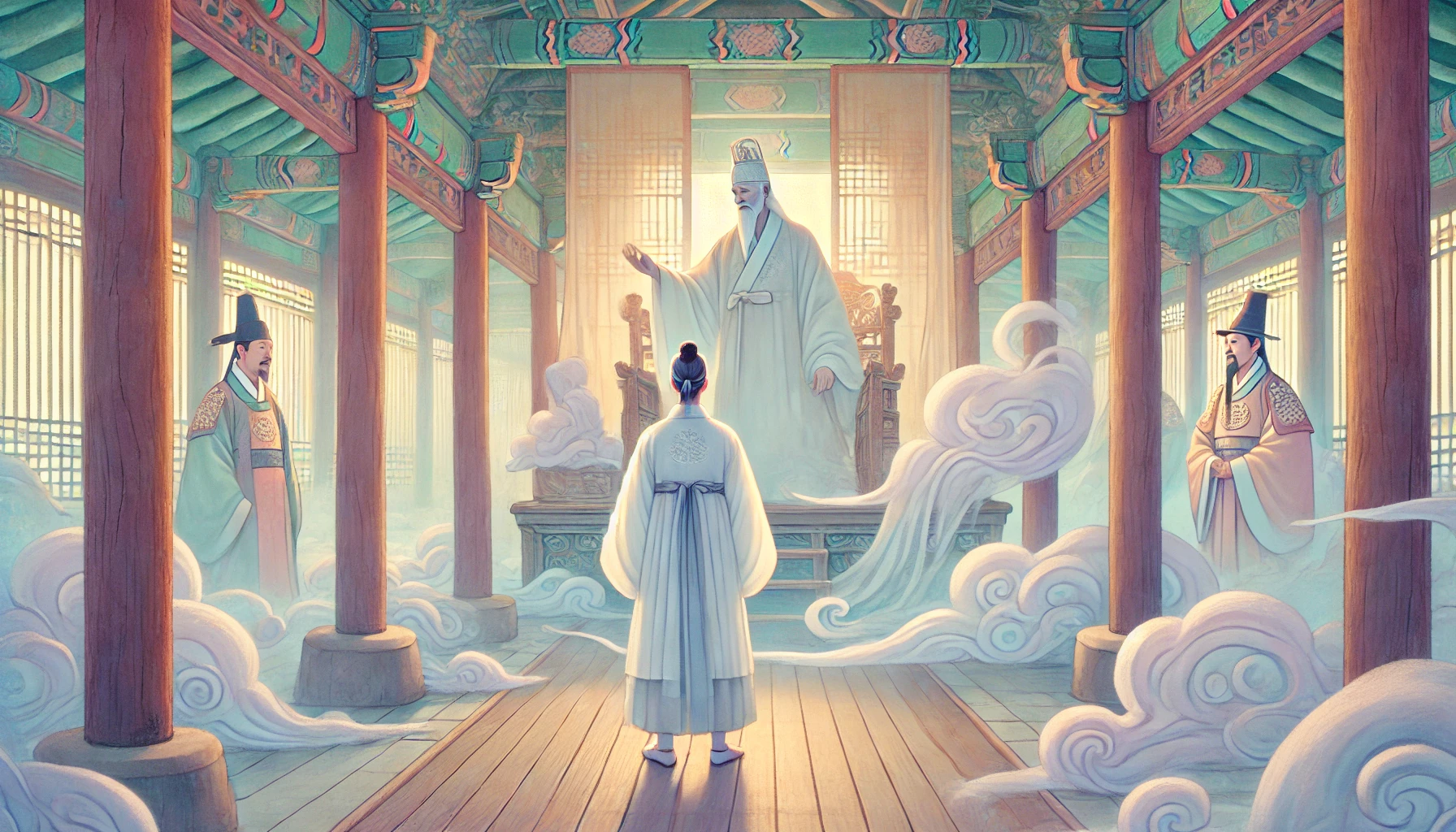 염라대왕이 낮고 무거운 목소리로 물었습니다. "한양 북촌에 살던 선비 김생, 네가 그 자냐?" 그 목소리는 천둥처럼 웅장했지만 동시에 따뜻함이 느껴졌습니다.