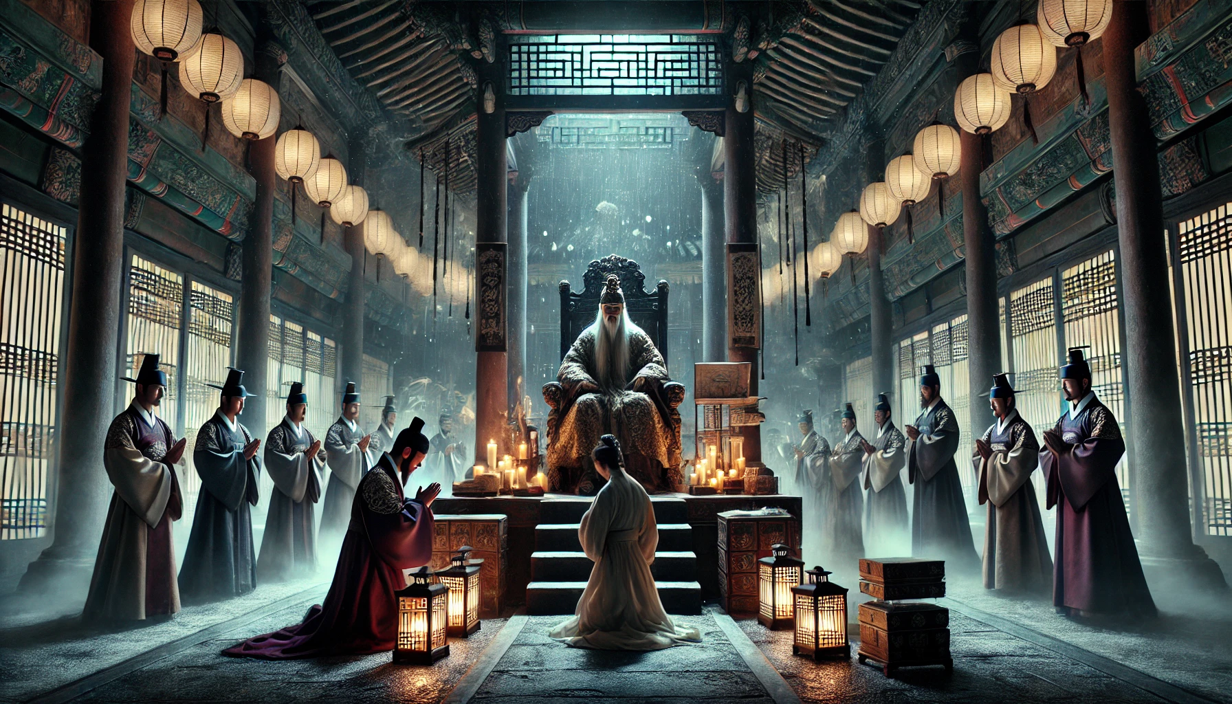 염라대왕은 깊이 고민하는 표정을 지었습니다. 이경모는 무릎을 꿇은 채, 자신의 운명이 결정되기를 기다렸습니다.