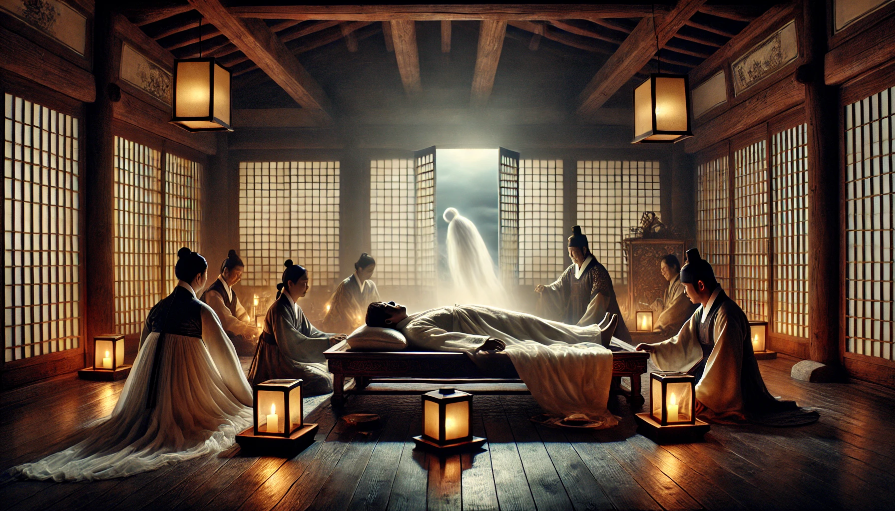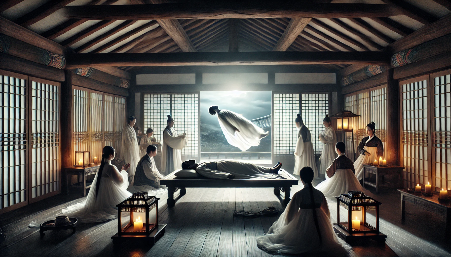 공주 외곽 이경모의 집, 그의 시신은 이미 수의를 입히고 입관 준비가 끝난 상태였습니다. 상주복을 입은 맏아들 준호는 넋이 나간 채 아버지의 관 옆에 앉아 있었고, 부인 김씨는 손수건으로 눈물을 훔치며 마지막 작별 인사를 하고 있었습니다.