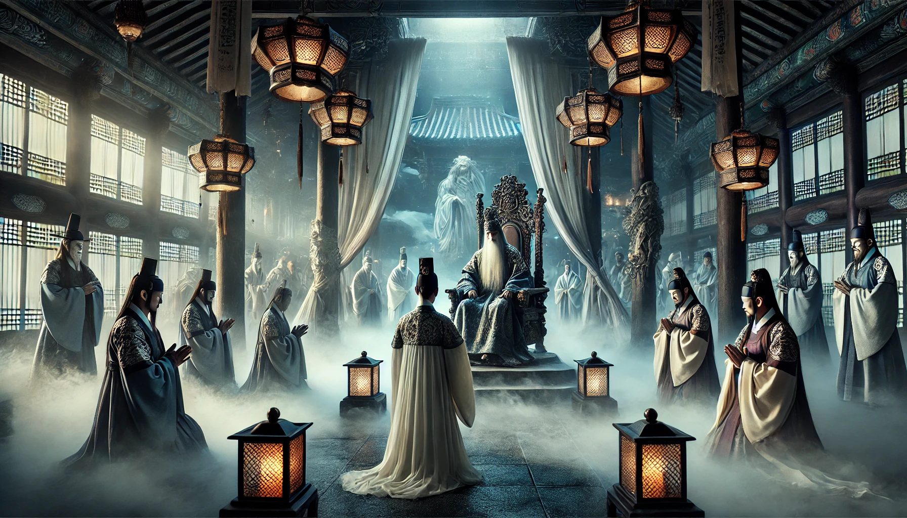 저승궁 안으로 들어선 이경모는 숨이 멎는 광경을 목격했습니다. 웅장한 전각 가운데에는 거대한 옥좌가 있었고, 그 위에 위엄 있는 모습의 염라대왕이 앉아 있었습니다. 그의 얼굴은 엄격했으나, 눈빛에는 공정함이 깃들어 있었습니다. 좌우로는 판관들이 줄지어 서 있었고, 전각 아래에는 붉은 옷을 입은 사자들과 녹색 옷을 입은 서기들이 분주히 움직이고 있었습니다.