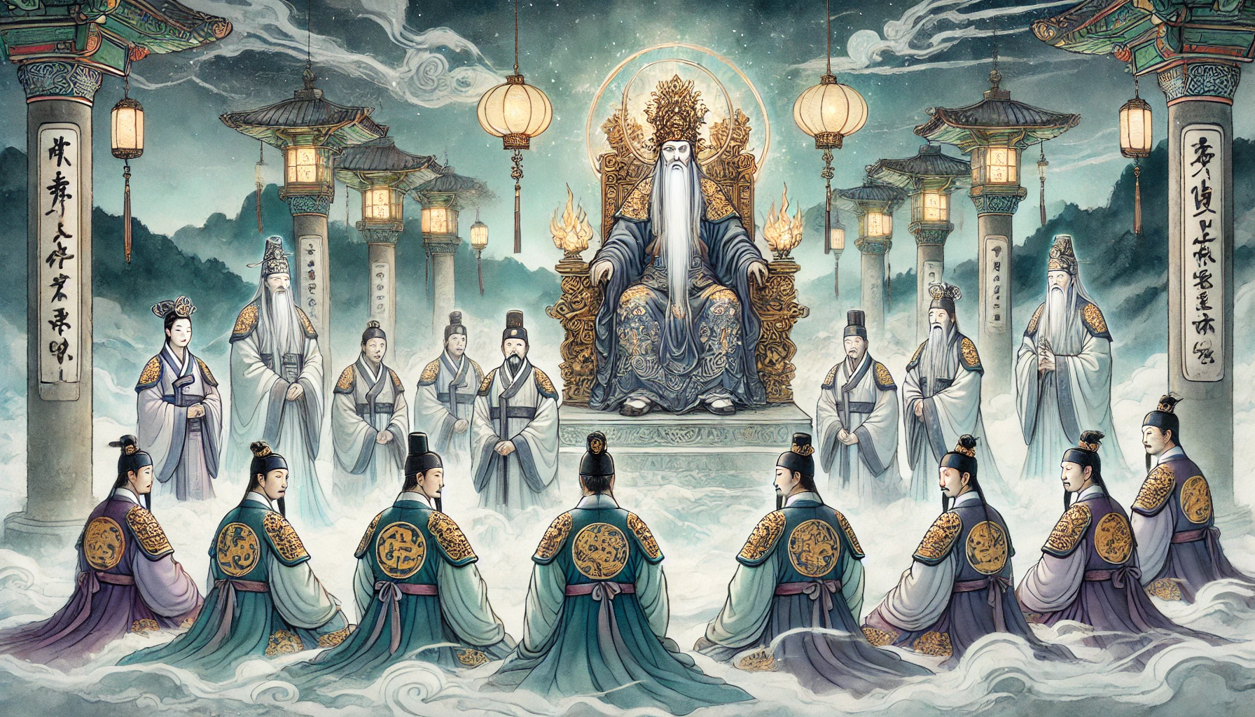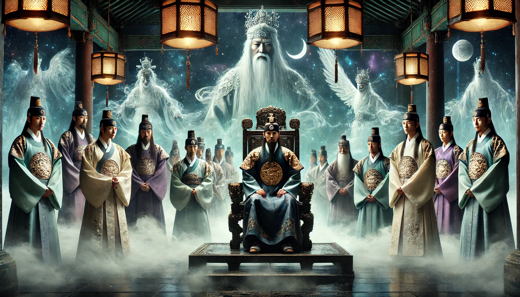 칠흑 같은 어둠 속에서 들려오는 저승사자들의 발걸음 소리. 차가운 쇠사슬이 땅에 끌리는 소리와 함께 무거운 문이 열리고, 저승의 법정이 모습을 드러낸다. 높은 천장에서는 붉은 안개가 피어오르고, 열 개의 기둥이 법정을 지탱하고 있다. 그 한가운데 거대한 책상 앞에 염라대왕이 앉아 있다. 그의 얼굴은 검푸른 빛을 띠고, 눈에서는 불꽃이 피어오른다. 손에는 생사부가 펼쳐져 있다.