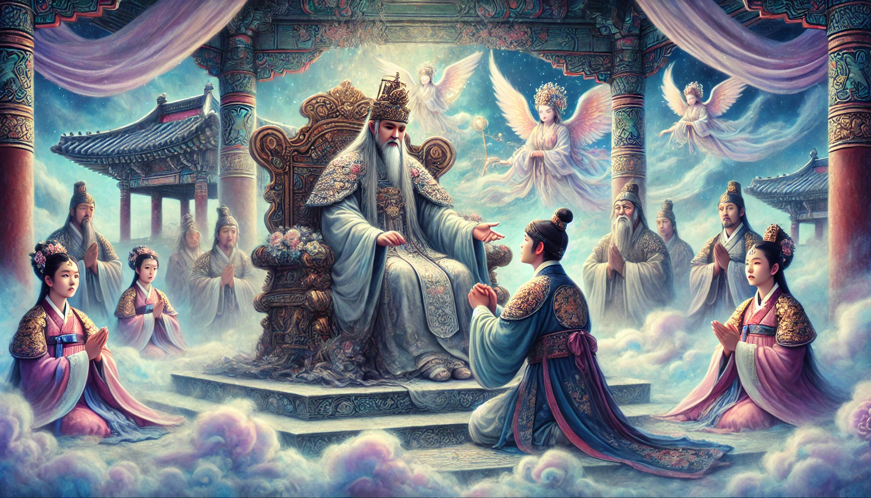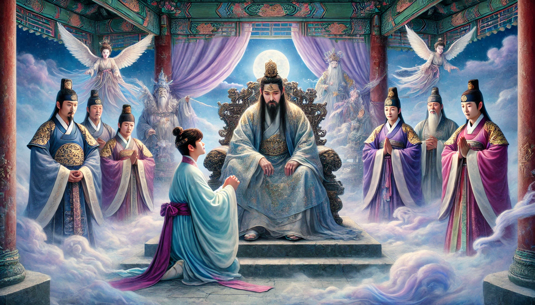저승사자들이 윤효문을 전각 안으로 안내했습니다. 전각 내부는 더욱 장엄했습니다. 높은 천장, 화려한 장식, 그리고 중앙에는 높은 옥좌가 있었습니다. 그곳에 염라대왕이 앉아 계셨습니다. 염라대왕은 위엄 있는 모습이었습니다. 그의 눈빛은 날카로웠고, 그 앞에 서면 모든 것이 다 드러나는 것 같은 느낌이었습니다.