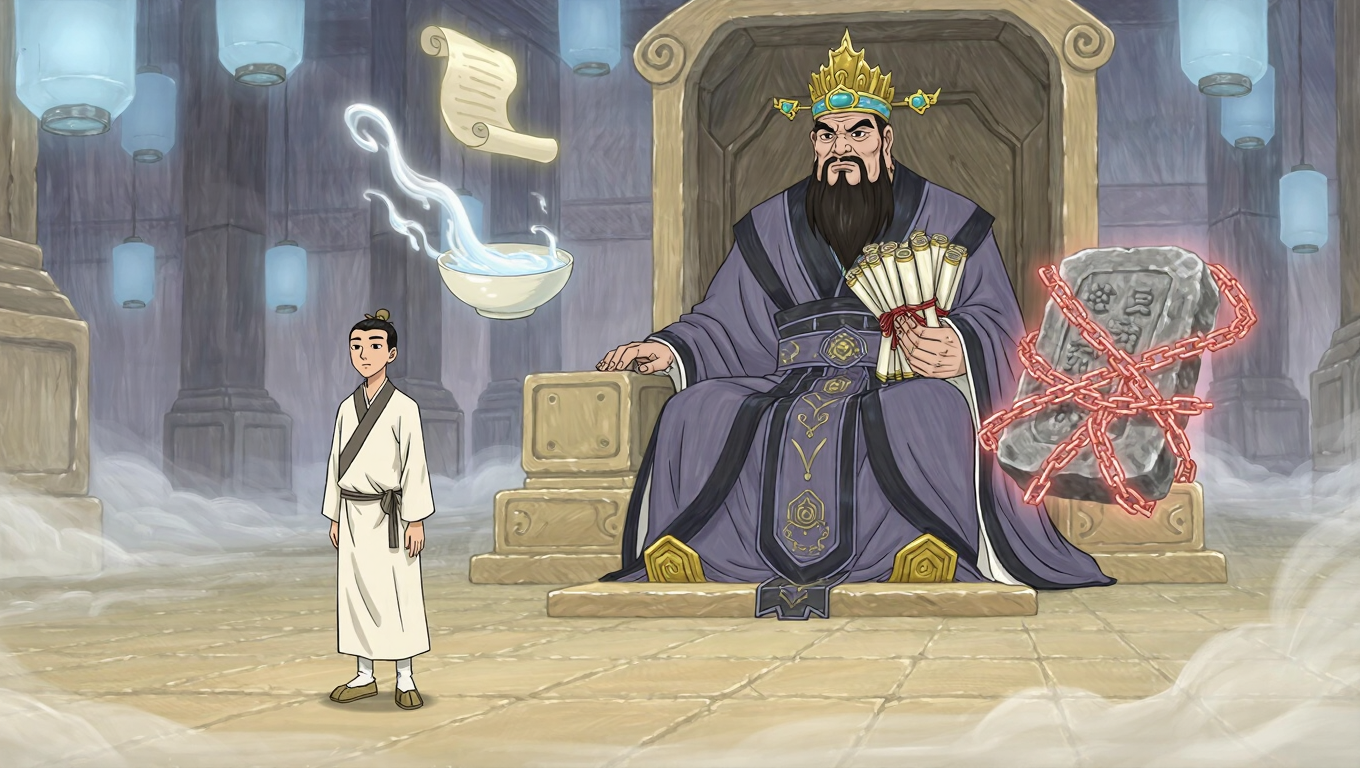 염라대왕은 생사부를 펼쳐 들었습니다. "사실 네 이름이 저승 장부에 오른 것은 잘못이었다. 네가 죽을 시간은 아직 한참 남아 있다. 하지만 나는 일부러 너를 불러들였다. 네 진심을 확인하고, 만약 네가 진정으로 효성스러운 사람이라면 특별한 선물을 주고 싶었기 때문이다." 김성운은 놀라서 염라대왕을 바라보았습니다. "대왕님, 소인은 그저 마땅한 도리를 했을 뿐인데 무슨 선물을 받을 자격이 있겠습니까?"