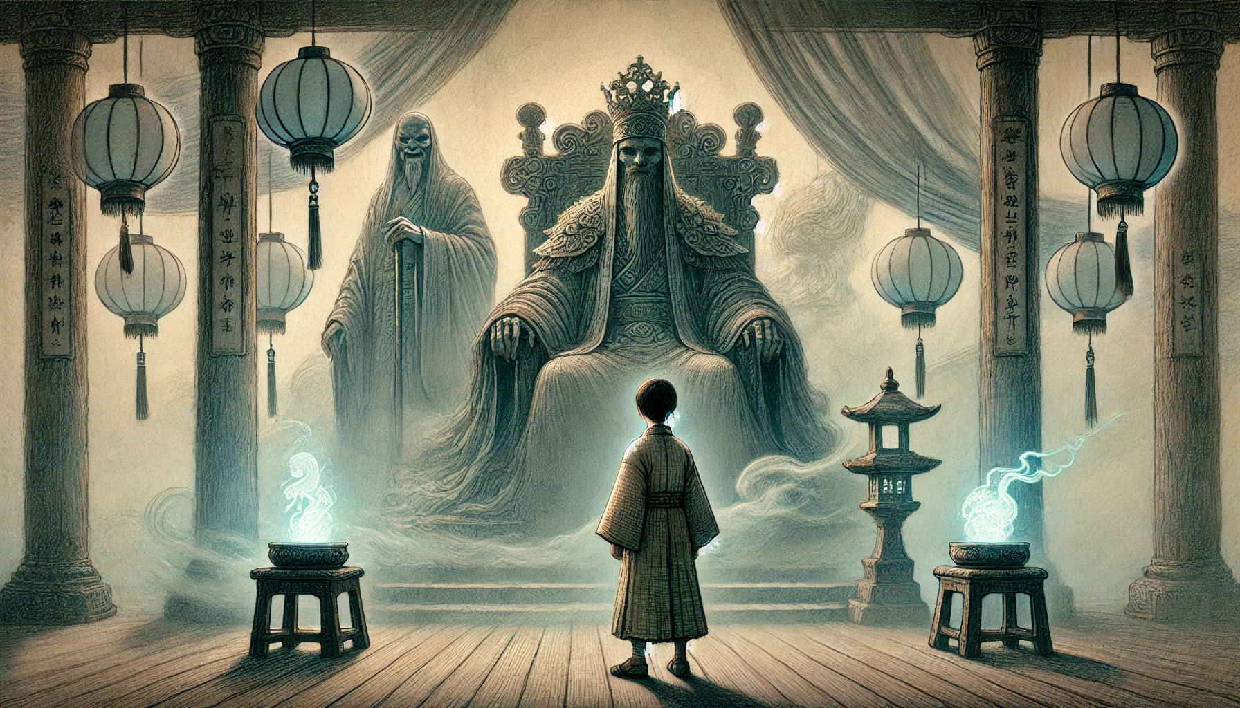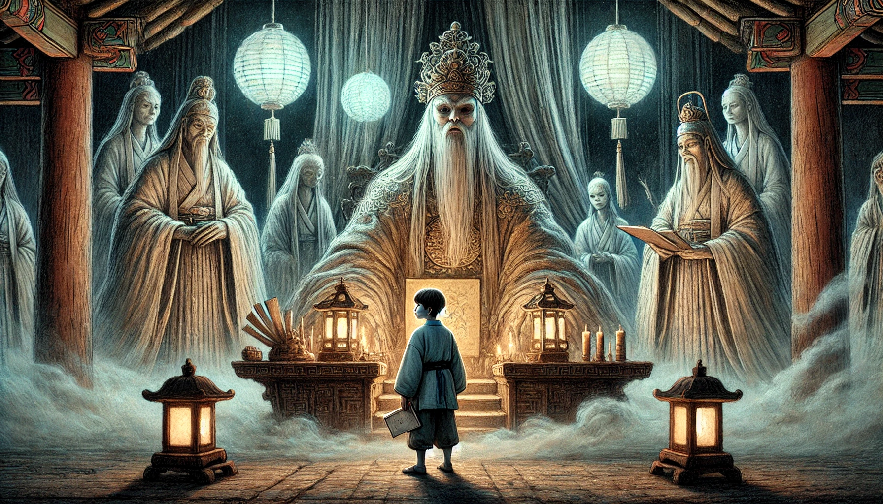 김성운은 저승사자를 따라 거대한 전각 안으로 들어갔습니다. 안은 놀라울 정도로 웅장했습니다. 높은 천장에는 구름 무늬가 그려져 있었고, 사방 벽면에는 사람들의 일생이 그림으로 새겨져 있었습니다. 선한 일을 한 사람들과 악한 일을 한 사람들의 모습이 생생하게 그려져 있어 보는 이로 하여금 절로 숙연해지게 만들었습니다. 전각 한가운데에는 높은 옥좌가 있었고, 그 위에 엄숙한 표정의 염라대왕이 앉아 계셨습니다.