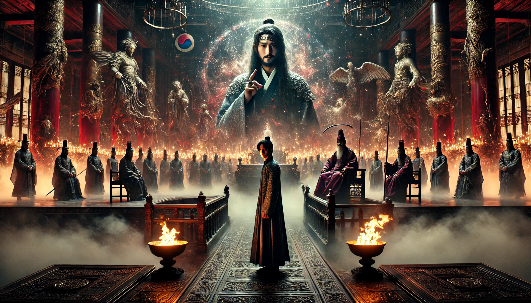 억울한 죽음을 맞이한 이선우의 영혼은, 육신이라는 굴레를 벗어나자 한 줄기 빛에 이끌려 끝 모를 어둠 속으로 나아가기 시작했습니다. 그가 지나가는 길, 황천길의 양옆에서는 수많은 영혼들이 통곡하고 있었습니다. 재물에 대한 미련, 권력에 대한 집착, 사랑하는 이에 대한 그리움으로 발을 떼지 못하고 울부짖는 영혼들. 하지만 이선우의 영혼은 그 어떤 것에도 미동하지 않았습니다. 그의 영혼을 감싸고 있는 것은 오직, 나라와 임금을 지키지 못했다는 깊고도 시린 슬픔뿐이었습니다. 얼마나 지났을까, 그의 눈앞에 거대한 성문이 나타났습니다. 저승의 입구, 풍도였습니다. 소머리 나찰과 말머리 옥졸들이 창을 들고 영혼들을 무자비하게 몰아치고 있었습니다. 그곳을 지나자, 불꽃이 강처럼 흐르는 도산지옥과 칼날이 숲처럼 솟아있는 검수지옥이 눈앞에 펼쳐졌습니다. 살아생전 지은 죄의 무게에 따라, 영혼들은 각각의 지옥에서 끔찍한 형벌을 받으며 비명을 지르고 있었습니다. 그 모든 아수라장을 지나, 이선우의 영혼은 마침내 저승의 최종 법정, 염라대왕의 심판대 앞에 당도했습니다. 거대한 궁전은 수만 개의 횃불로 밝혀져 있었으나, 그 빛은 따스함 대신 서늘한 위압감만을 내뿜고 있었습니다. 옥좌에 앉은 염라대왕의 모습은 산처럼 거대하고 바다처럼 깊었습니다. 수천, 수만 년간 인간 세상의 모든 죄와 업보를 지켜봐 온 그의 눈빛은, 그 어떤 거짓이나 변명도 꿰뚫어 볼 듯 서슬이 퍼렇습니다. 그의 양옆으로는 저승의 다른 시왕(十王)들이 판관들과 함께 도열해 있었고, 죄인의 일생을 비추는 거울, 업경대(業鏡臺)는 차가운 빛을 발하고 있었습니다. 먼저 심판대에 오른 영혼들은 저마다 살기 위해 발버둥 쳤습니다. “염라대왕님, 억울합니다! 저는 아무것도 모릅니다!” 라며 악을 쓰는 영혼, “한 번만, 제발 한 번만 용서해 주십시오!”라며 바닥에 엎드려 비는 영혼, “네놈들이 뭔데 나를 심판하느냐!”라며 끝까지 발악하는 영혼까지. 법정은 그야말로 아비규환이었습니다. 마침내 이선우의 차례가 되었습니다. 피 묻은 죄수복을 입은 그의 영혼이 심판대 중앙에 서자, 소란스럽던 법정이 순간 조용해졌습니다. 다른 영혼들과는 너무나도 다른, 기이한 기운이 그에게서 흘러나오고 있었기 때문입니다. 그의 영혼에서는 죄인의 공포나 원망이 아닌, 성인의 그것과 같은 깊은 고뇌와 슬픔이 느껴졌습니다. 옥좌에 앉아 미동도 않던 염라대왕의 눈썹이 아주 희미하게 움직였습니다. 그는 수만 년간 수억의 영혼을 심판해왔지만, 이토록 맑고도 슬픈 영혼은 처음이었습니다. 염라대왕은 판관에게 명했습니다. “저 자의 생사록을 대령하라.” 죄인의 모든 생애가 기록된 거대한 두루마리가, 염라대왕의 앞에 펼쳐졌습니다. 이제, 지상의 법이 아닌 하늘의 법에 따른 진짜 심판이 시작될 참이었습니다.