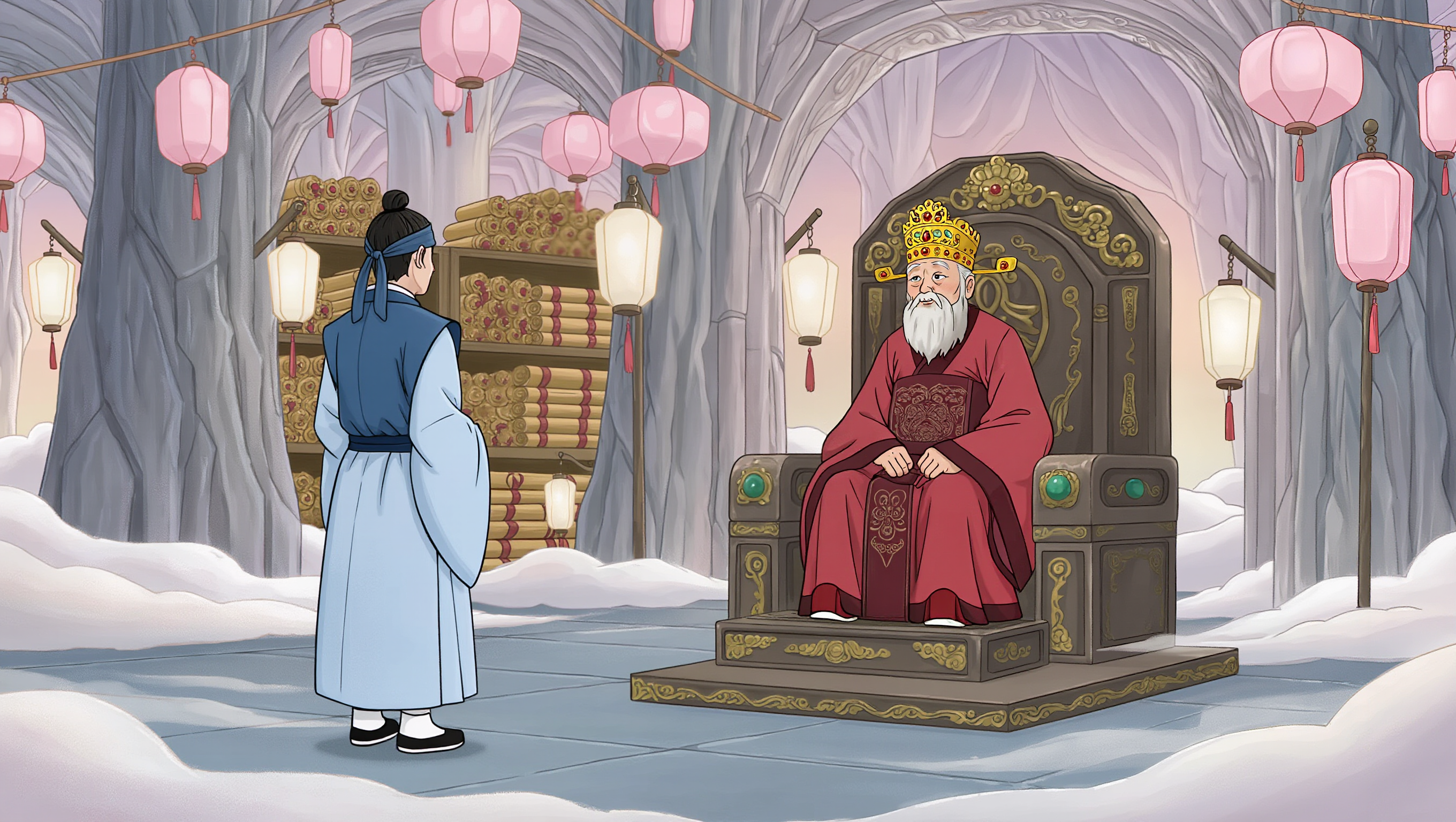 염라대왕님이 수염을 한 번 쓱 쓸어내리더니, 눈을 가늘게 뜨고 입을 뗍니다. "음, 김 서방아. 네가 어머니를 극진히 모신 효자라 하니, 내 마음이 조금 움직이기는 한다만... 저승의 문은 한 번 닫히면 열기 어려운 법. 자, 첫 번째 질문이다. 정신 바짝 차리고 대답하거라. 만약 네가 내 마음에 차지 않는 소리를 한다면, 너는 당장 저기 보이는 독사 지옥으로 던져질 것이다!" 대왕님이 손가락 하나를 딱 세우는데, 그 손가락 끝에서 푸른 도깨비불이 '치르르' 피어오르는 게 아니겠어요? 주변에 서 있던 판관들이 붓을 고쳐 쥐고 김 서방의 입술만 쳐다봅니다.