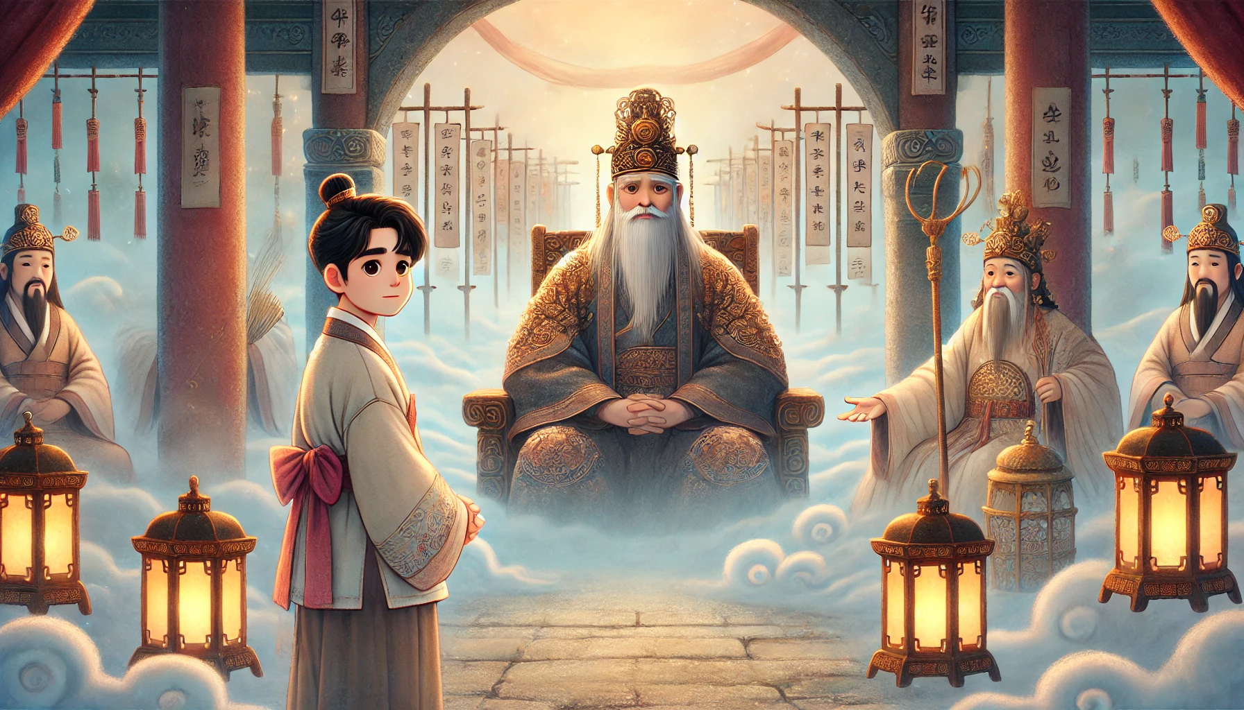 "험험! 제법 그럴듯한 소리를 하는구나. 네 마음의 무게가 무겁다는 것은 알겠다. 하지만 겨우 첫 번째 문제일 뿐이다! 너무 좋아하지 마라. 이제 두 번째 질문을 하겠다." 대왕님이 짐짓 엄한 척하며 다음 문제를 준비하려는데, 입가에 살짝 걸린 미소는 차마 숨기지 못하셨어요. 대왕님도 신(神)이기 이전에 한때는 인간이었을 터, 효심 앞에서는 어쩔 수 없는 모양입니다.