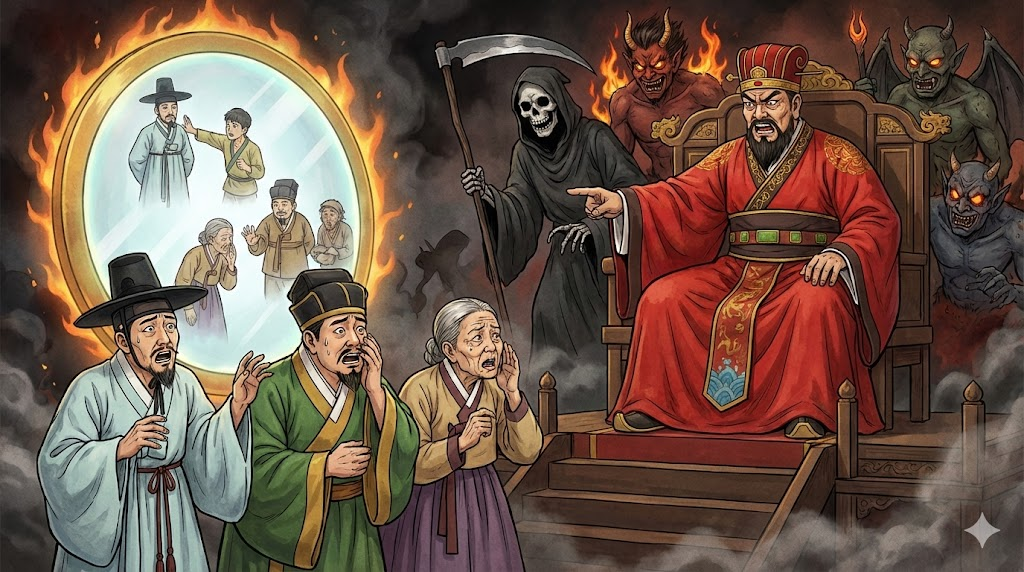 염라대왕이 그 꼴을 보더니 피식 비웃음을 흘립니다. "허허, 법 없이도 산다? 그래, 인간 세상 법으로는 죄가 없겠지. 허나 내 눈은 속여도 하늘의 그물은 못 속이는 법! 여봐라, 업경대(이승의 일을 비추는 거울)를 대령해라! 저놈의 시커먼 속내를 만천하에 까발려 주마!"